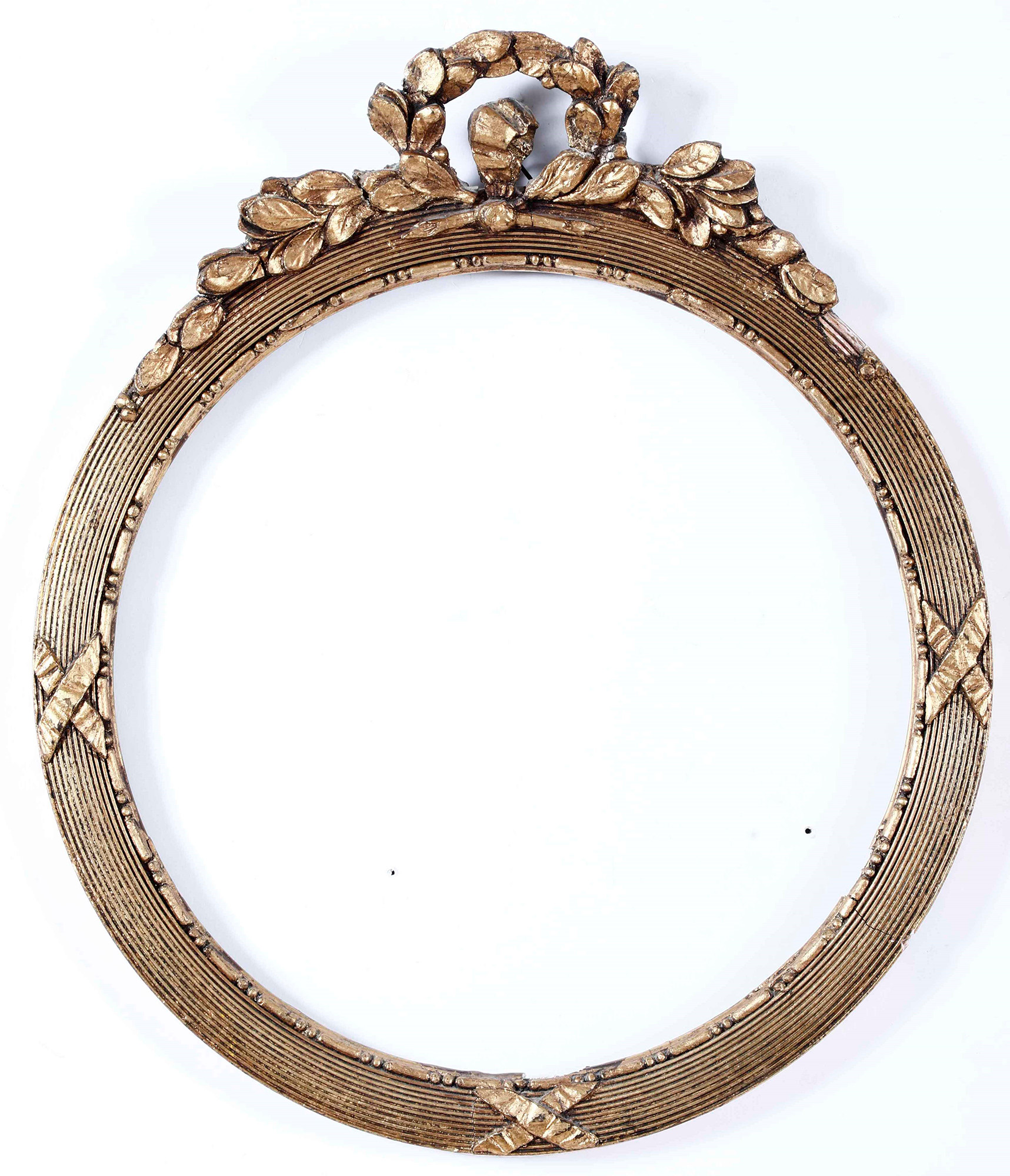 Cornice con mostra circolare il legno intagliato e dorato. XIX secolo, fascia scanalata, cimasa intagliata con festone fogliaceo, diametro cm 36, battuta interna cm 32