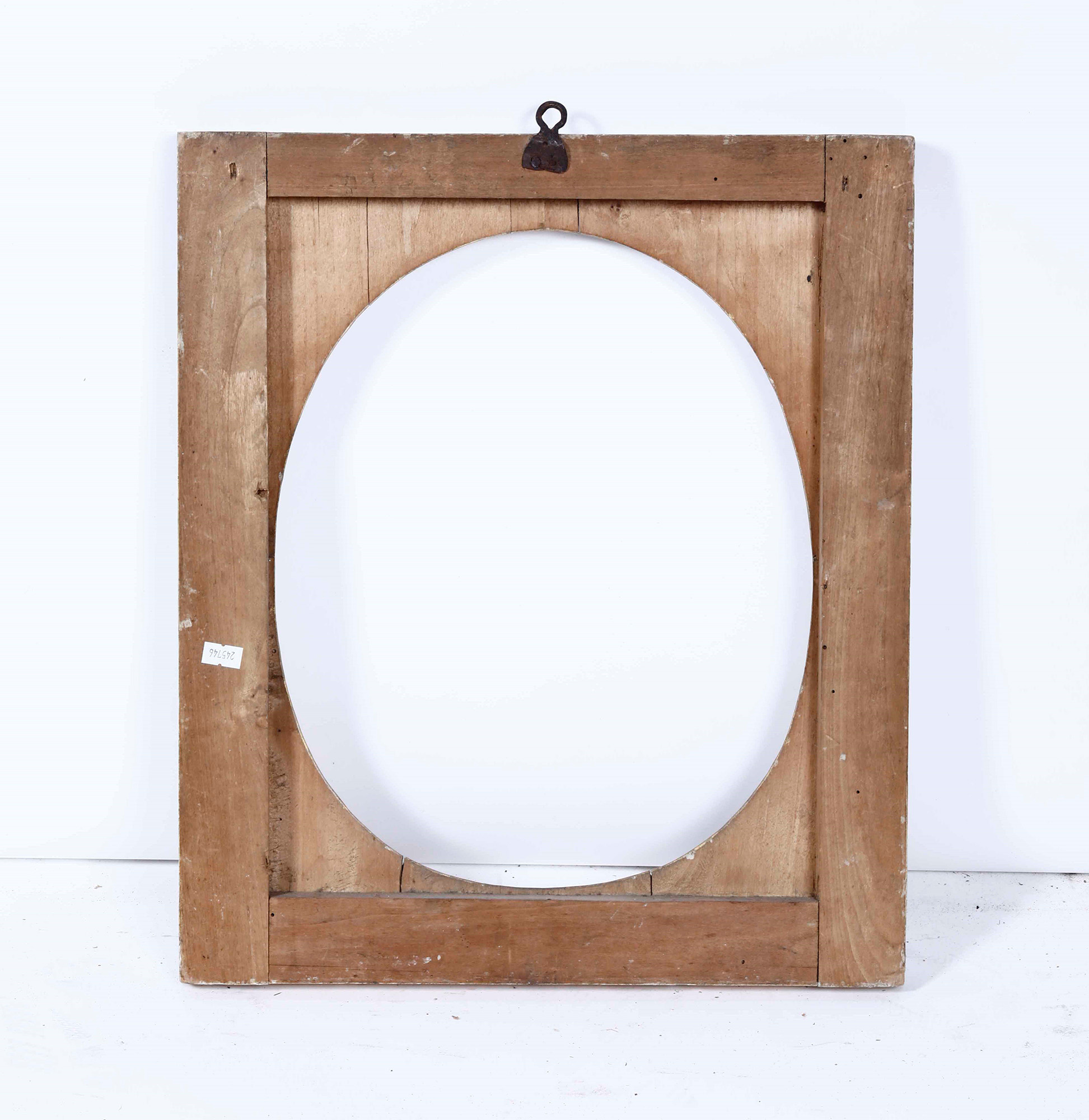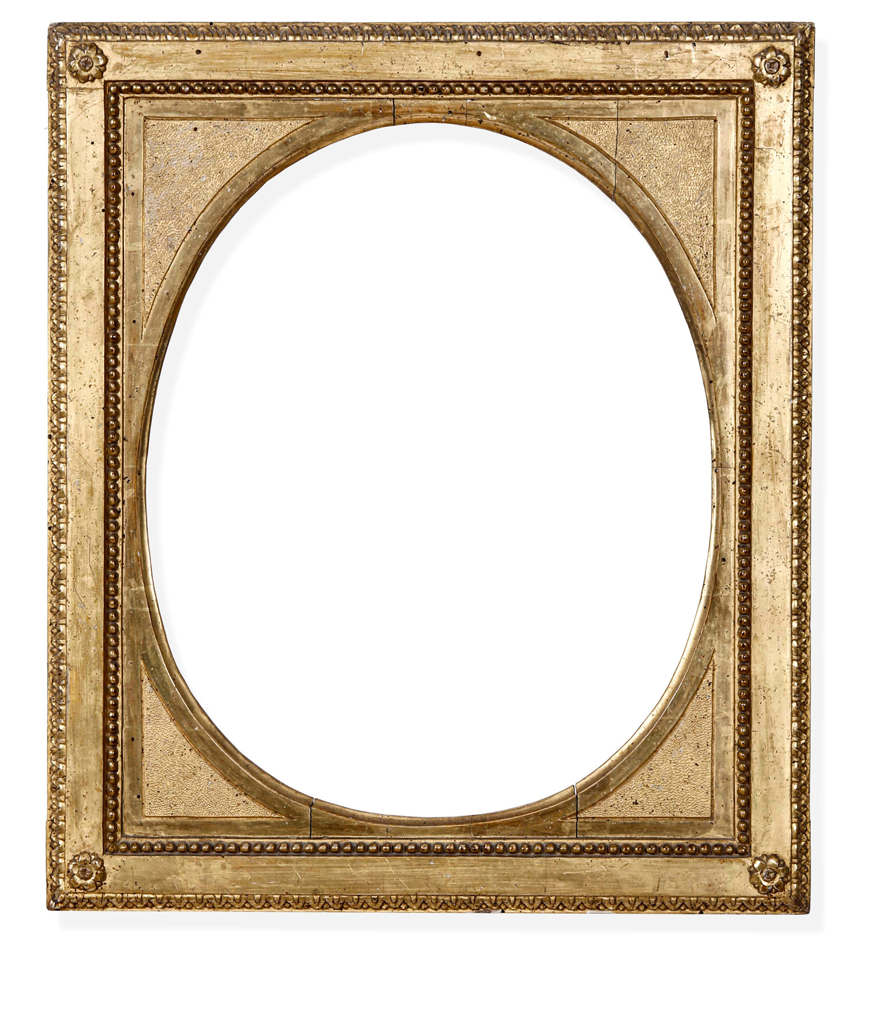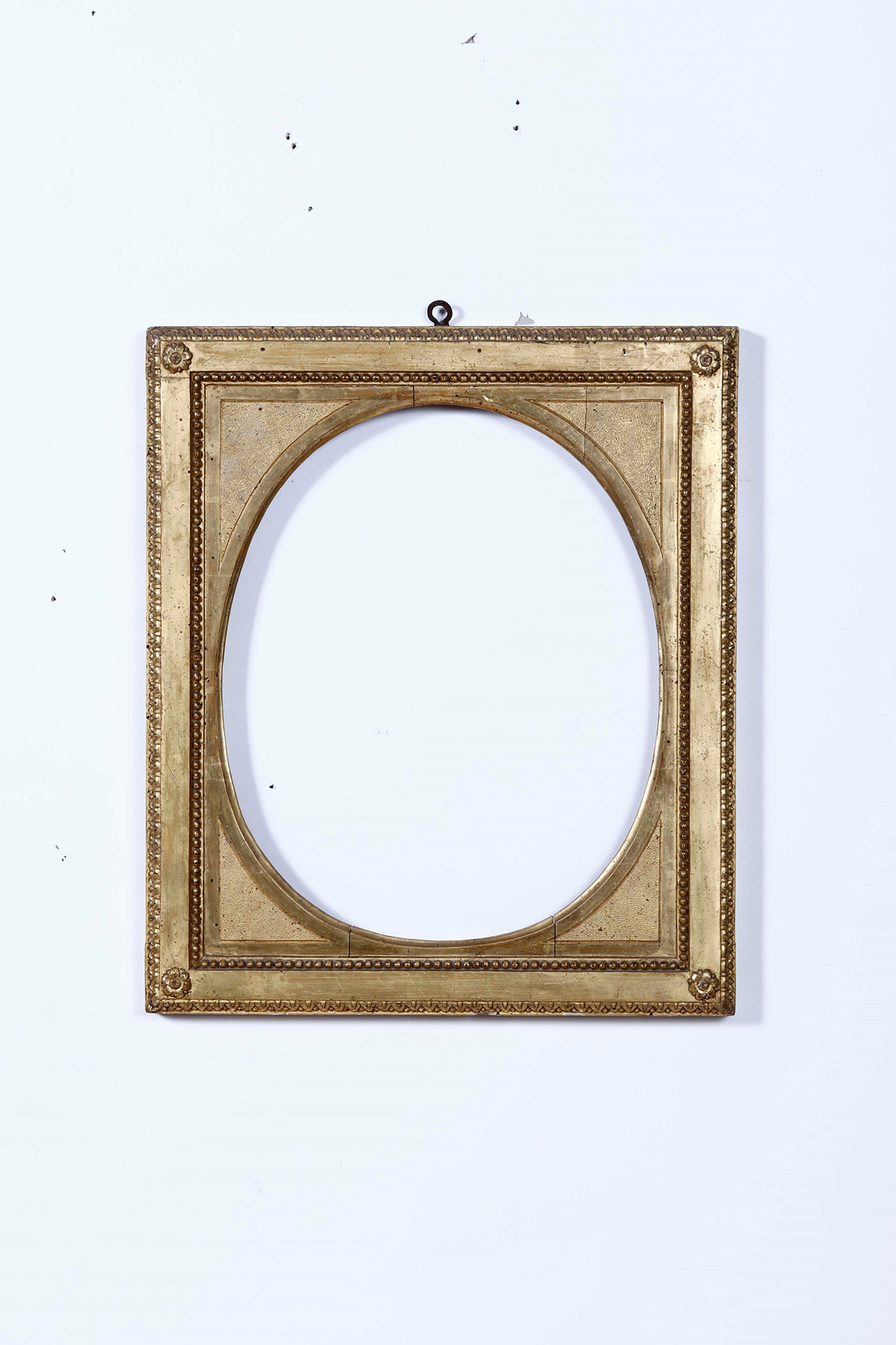 Cornice neoclassica in legno intagliato, dorato e bulinato. XIX secolo, con mostra ovale. Decori a perlinatura e foglie, cm 47,5x41,5, luce cm 37x30