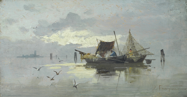 Scuola Veneta XX sec. ORA STANCA Olio su compensato, cm. 14,5x27 Firma in basso a destra; Fragiacomo. Sul verso a china: “Av Giorgio Chiarelli/ Novembre 1934/ Carlo Griffey”.