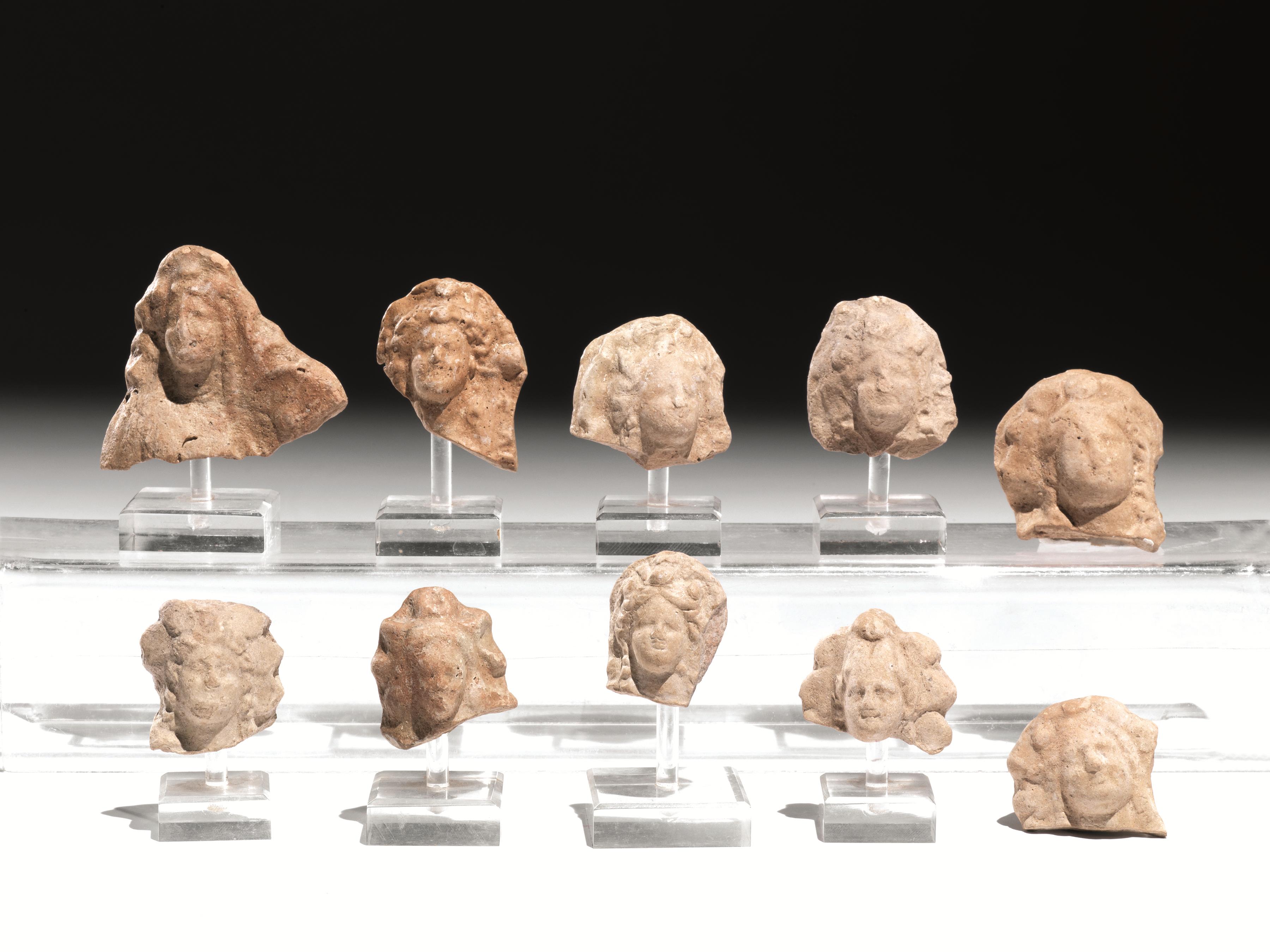 Dieci teste femminili tipo Tanagrina con diadema floreale e corona radiata