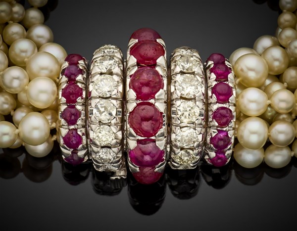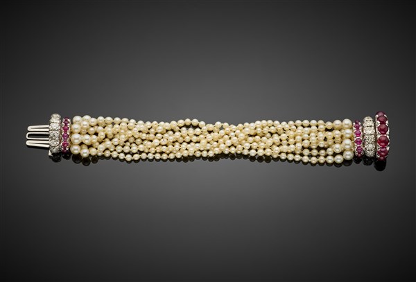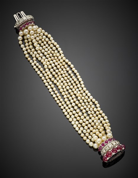 Bracciale a nove fili di perle in parte naturali leggermente a scalare con chiusura in oro bianco, diamanti rotondi per complessivi ct. 3,45 circa e rubini cabochon, g 49,54 circa, lungh. cm 17,80 circa. Marcato 301 AL.