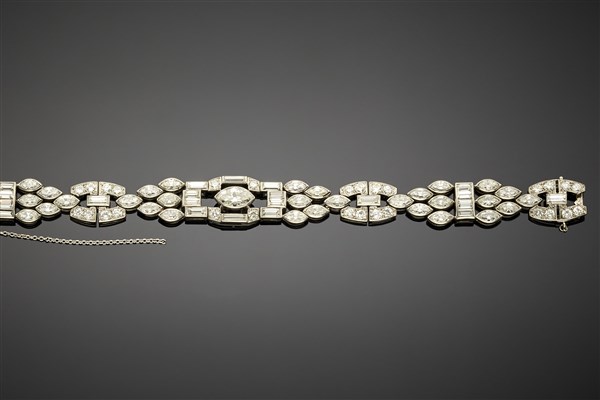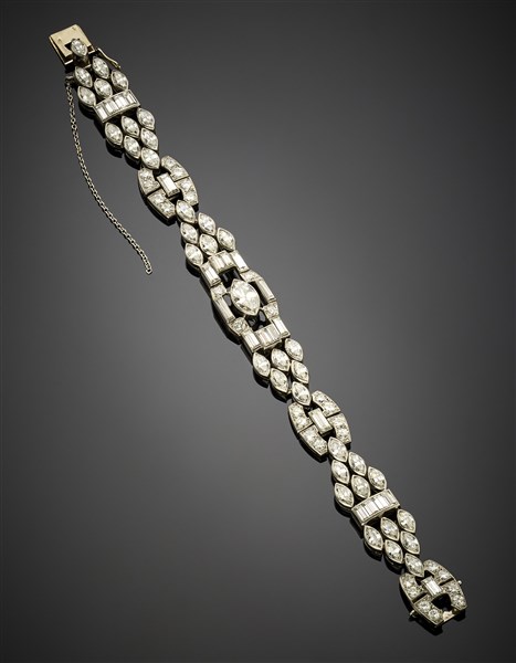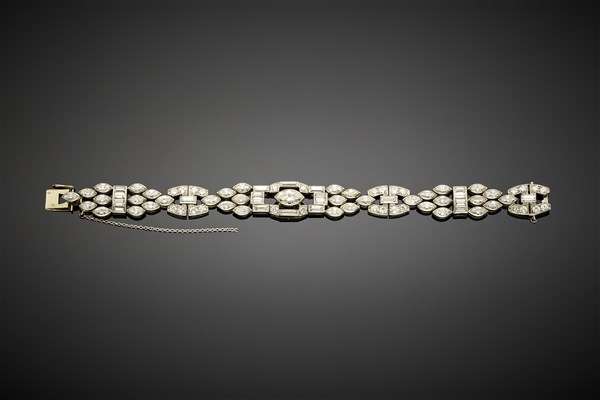 Bracciale modulare in platino, oro, diamanti a navette, baguette e rotondi per complessivi ct. 13,00 circa, al centro una navette di ct. 1,06 circa, g 34,76 circa. Marchi di assaggio per il platino, l'oro e l'orefice francesi. In scatola originale
