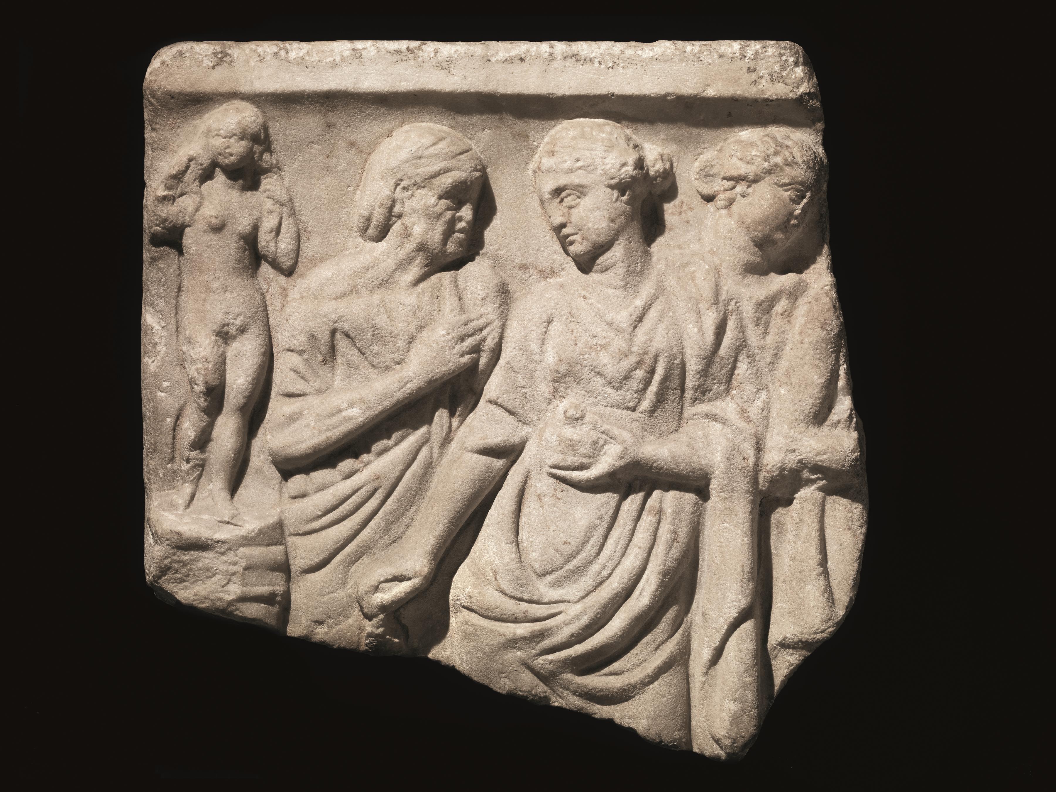 Bassorilievo di forma approssimativamente rettangolare con scena di voto a Venere da parte di alcune giovani donne; all’estrema sinistra si trova un simulacro di un’Afrodite Anadyomene raffigurata nuda nell’atto di strizzarsi i capelli, posta su una piccola base; di fronte alla statua una donna anziana stante e volta a sinistra con il braccio destro ripiegato sul corpo si rivolge ad una fanciulla volta a destra abbigliata con chitone e mantello in atto di recare al simulacro della divinità grani di d’incenso da bruciare; dietro alla fanciulla un’altra donna volta dalla parte opposta e parte di una quarta figura