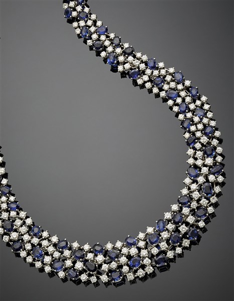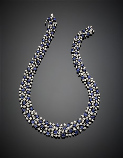 Collier in oro bianco con diamanti rotondi e zaffiri ovali e a cuscino, diamanti per complessivi ct. 17,00 circa, g 73,23 circa, lungh. cm 42 circa. In scatola originale