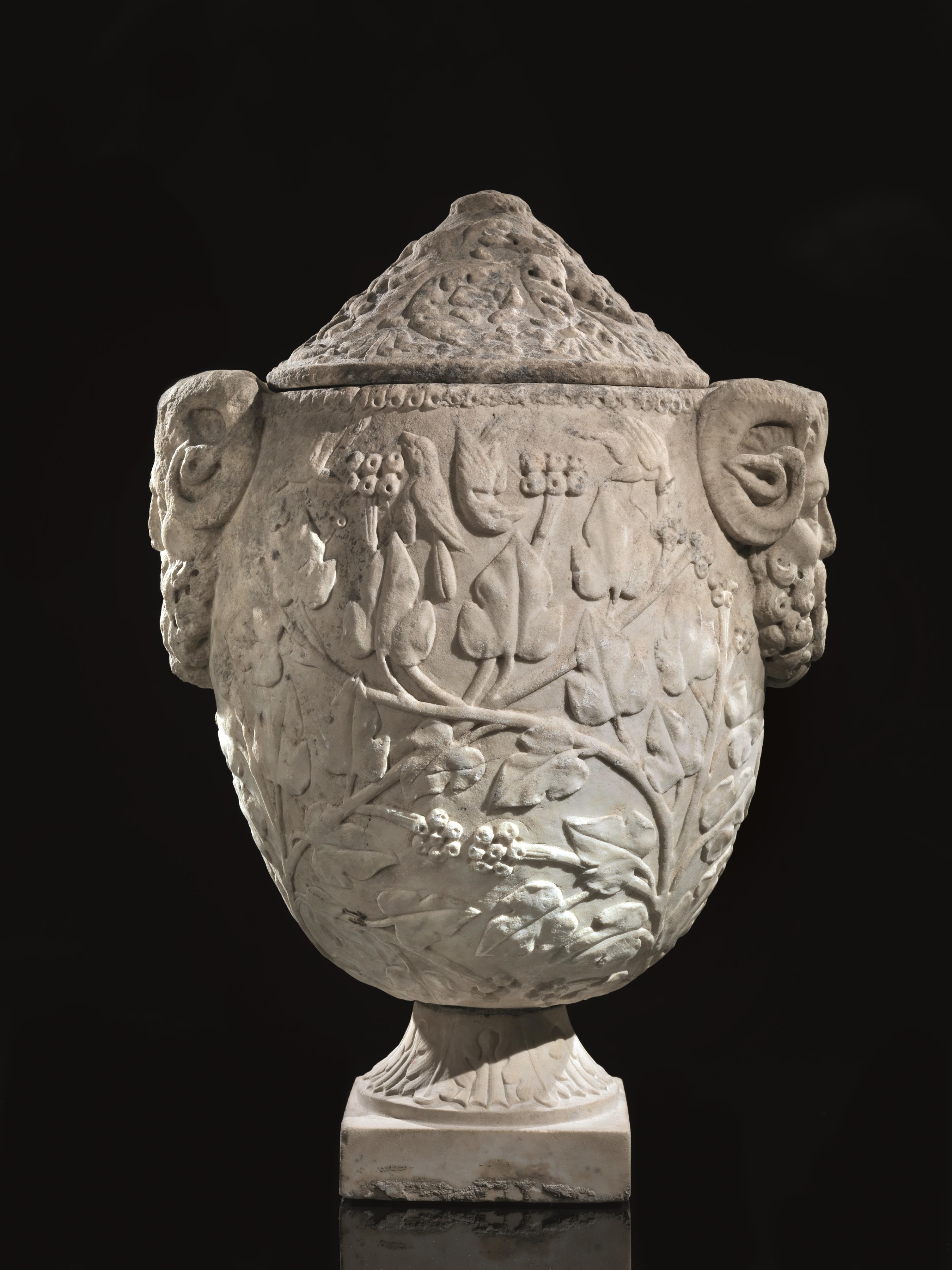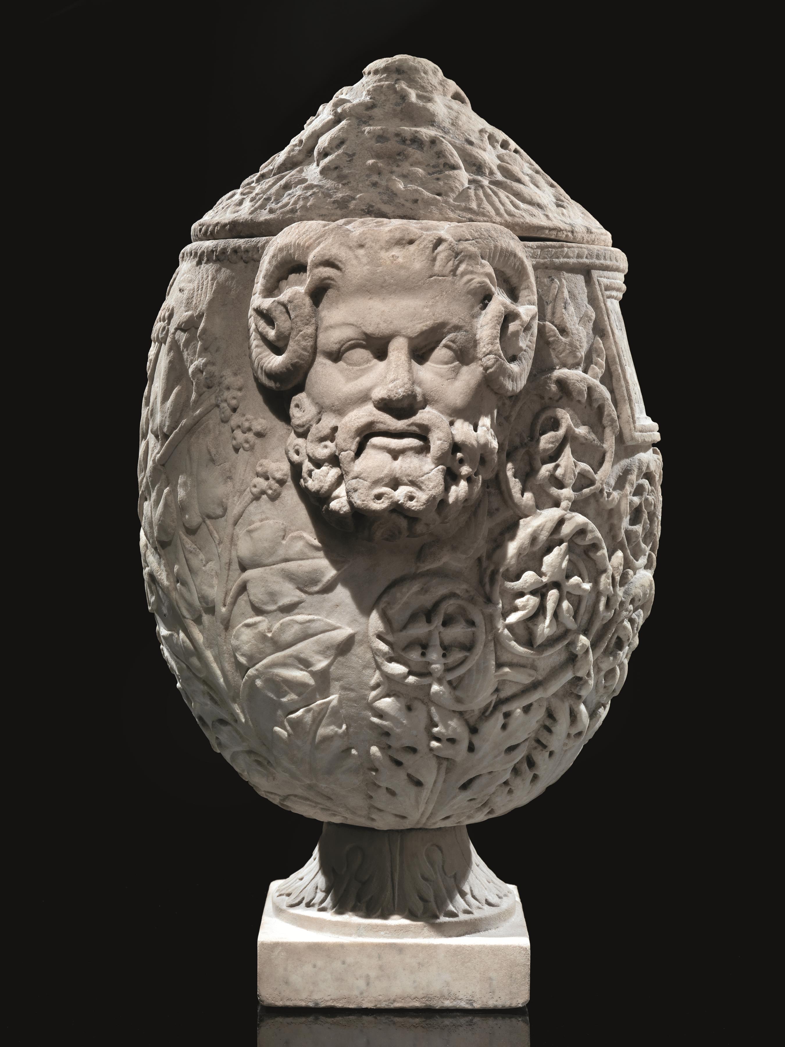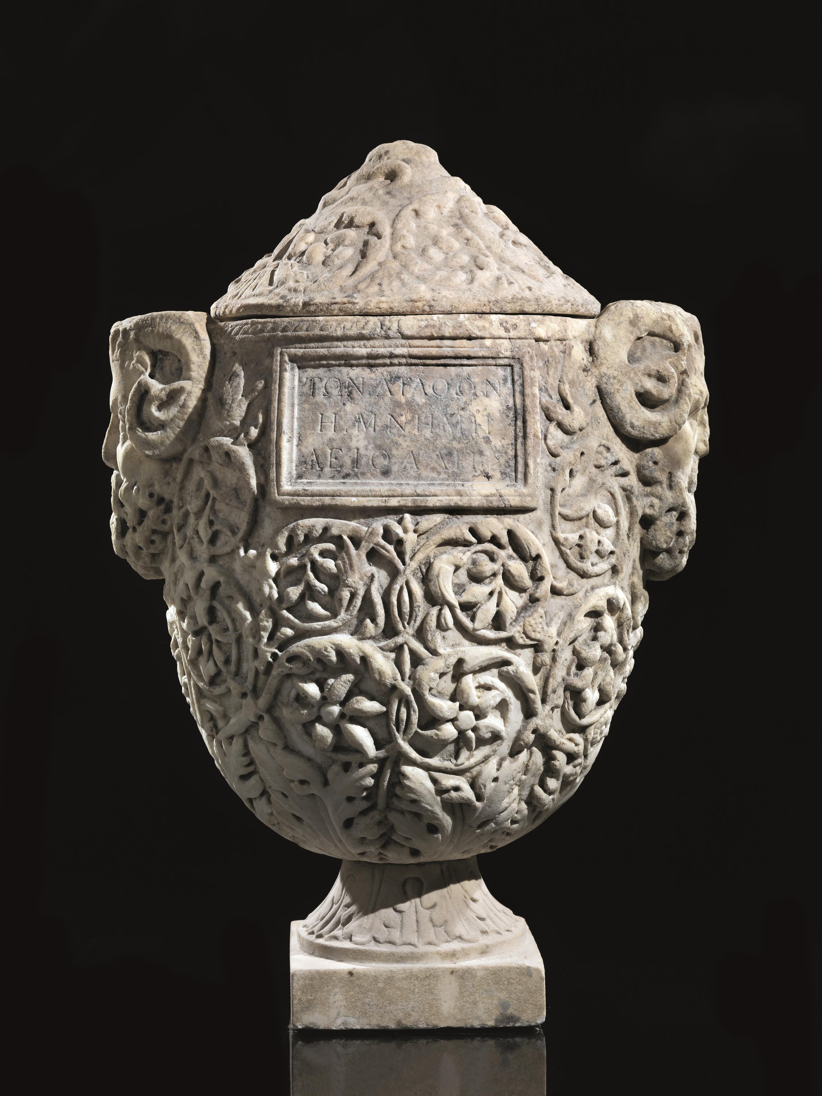 Decorazione Il coperchio è interamente scolpito a girali di foglie; lato A) centrato da una tabella con iscrizione in greco; l’orlo è inciso a falsa cordicella, il ventre scolpito in altorilievo con ampie volute di girali intervallate da fiori e uccelli in volo che partono da grandi foglie di acanto sul fondo del vaso; lato B) scolpito in bassorilievo con uccelli in volo in atto di cibarsi di frutti di un grande ramo; le anse a presa sono realisticamente modellate con volto di un satiro anziano dalle corna che si arricciano intorno alle orecchie a punta, naso schiacciato, zigomi sporgenti e folta barba a riccioli resa a trapano