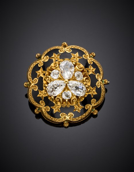Broche/pendente polilobata in oro giallo con smalti neri e diamanti old mine a goccia e a cuscino per complessivi ct. 2,30 circa, g 11,13 circa, diam. cm 3 circa. (lievi difetti)