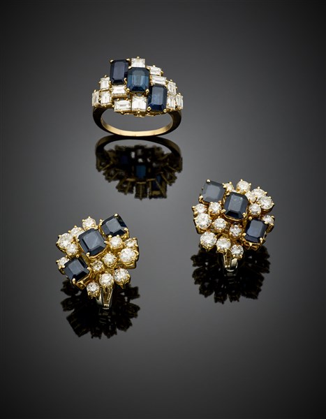Demi parure in oro giallo, diamanti rotondi e rettangolari per complessivi ct. 4,90 circa e zaffiri ottagonali composta da anello misura 15/55 e orecchini di cm 2 circa, complessivi g 22,18 circa.