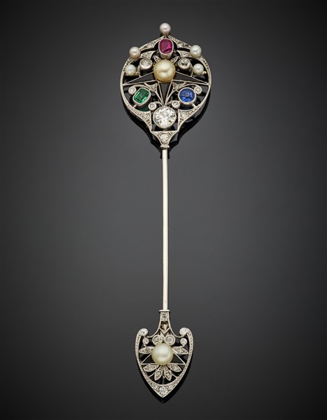 Platinum pin with ruby, emerald, sapphire, diamonds and pearls, onyx details, g 15.38 circa, length cm 10.70 circa. (defects and losses)