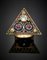 Anello triangolare in oro giallo con diamante rotondo di ct. 1,00 circa e rifinito con diamanti, rubini, zaffiri e smeraldi. g 12,33 circa misura 13/53. Marchi di assaggio e dell'orefice francesi.