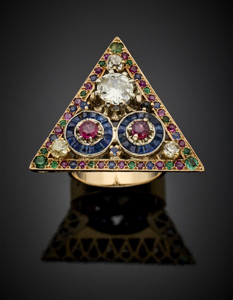 Anello triangolare in oro giallo con diamante rotondo di ct. 1,00 circa e rifinito con diamanti, rubini, zaffiri e smeraldi. g 12,33 circa misura 13/53. Marchi di assaggio e dell'orefice francesi.