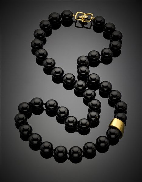 Onyx bead necklace of mm 17.50/18.30 circa with a yellow gold centerpiece and clasp finished in diamonds, g 348.82 circa, length cm 86 circa. Signed Angela Cummings, Tiffany & Co, 1981, 1984.
