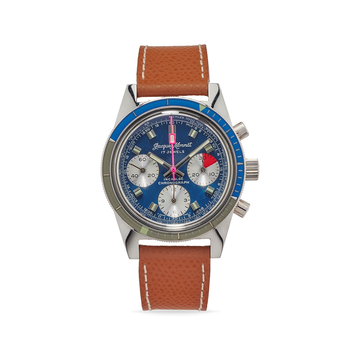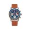 Cassa tonneau in acciaio, lunetta acrilica blu e grigia, pulsanti tondi.