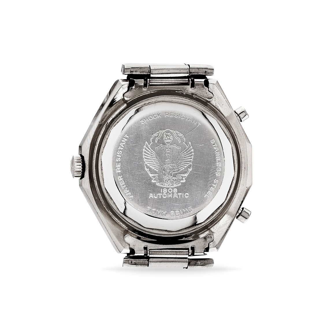 Cassa tonneau in acciaio, lunetta girevole, pulsanti tondi, fondello con logo esercito iracheno.