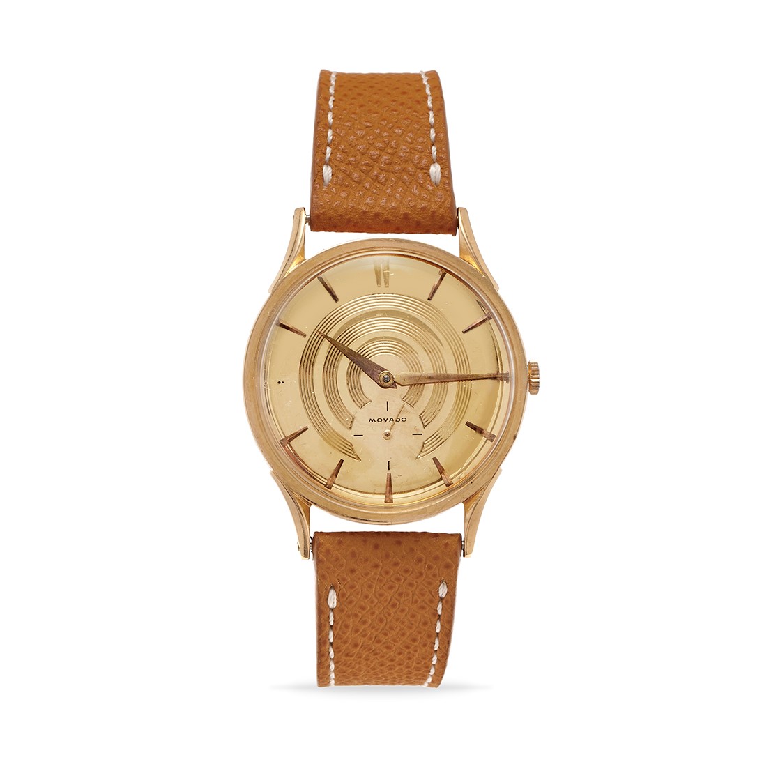 Quadrante in oro con incisioni concentriche, indici applicati.