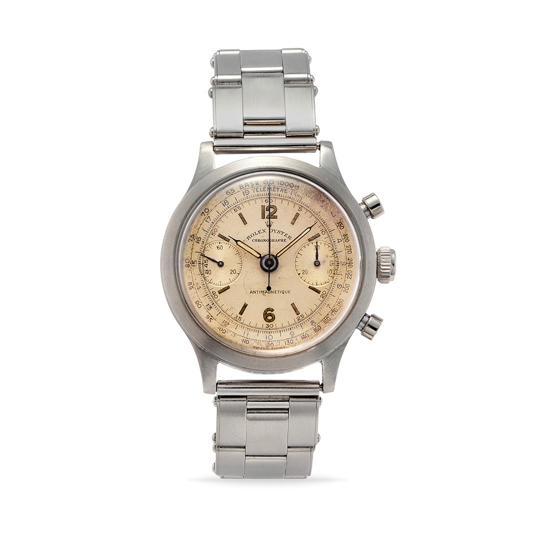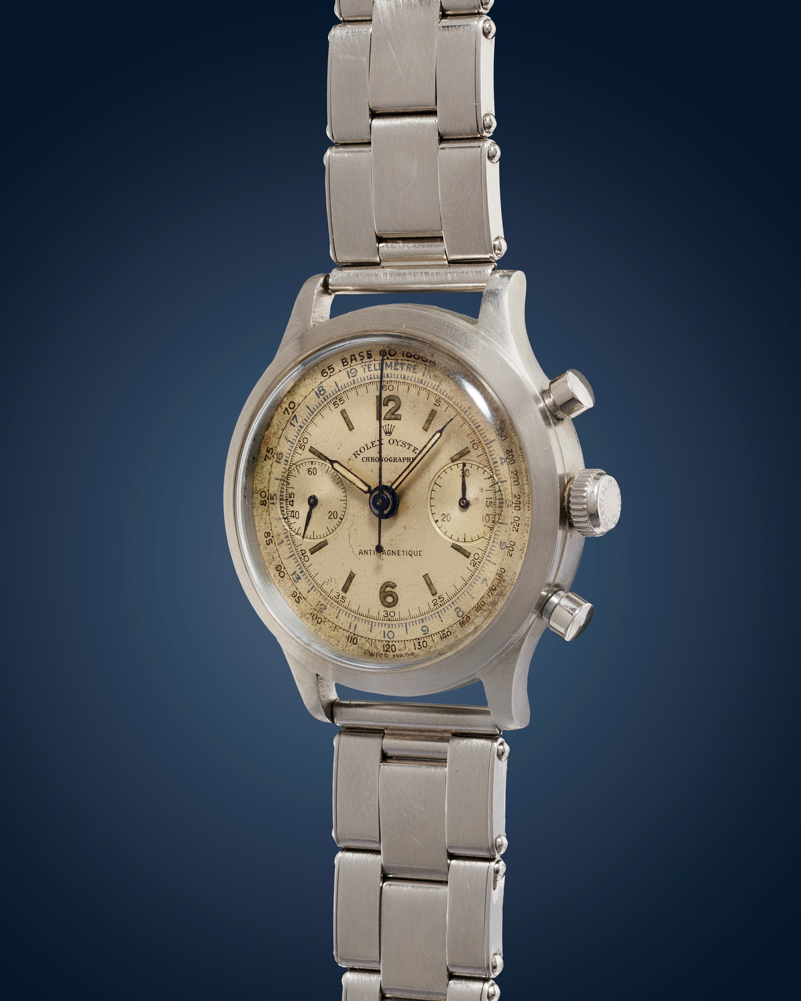Note: Lanciata nel 1939, la referenza 3525 fu il primo cronografo Rolex ad essere equipaggiato di una cassa Oyster, con fondello a vite e corona “Patent Oyster”. Gli esemplari della prima serie si distinguono per il seriale impresso sul fondello, mentre i modelli della seconda serie, come il presente orologio, hanno questi numeri incisi tra le anse.