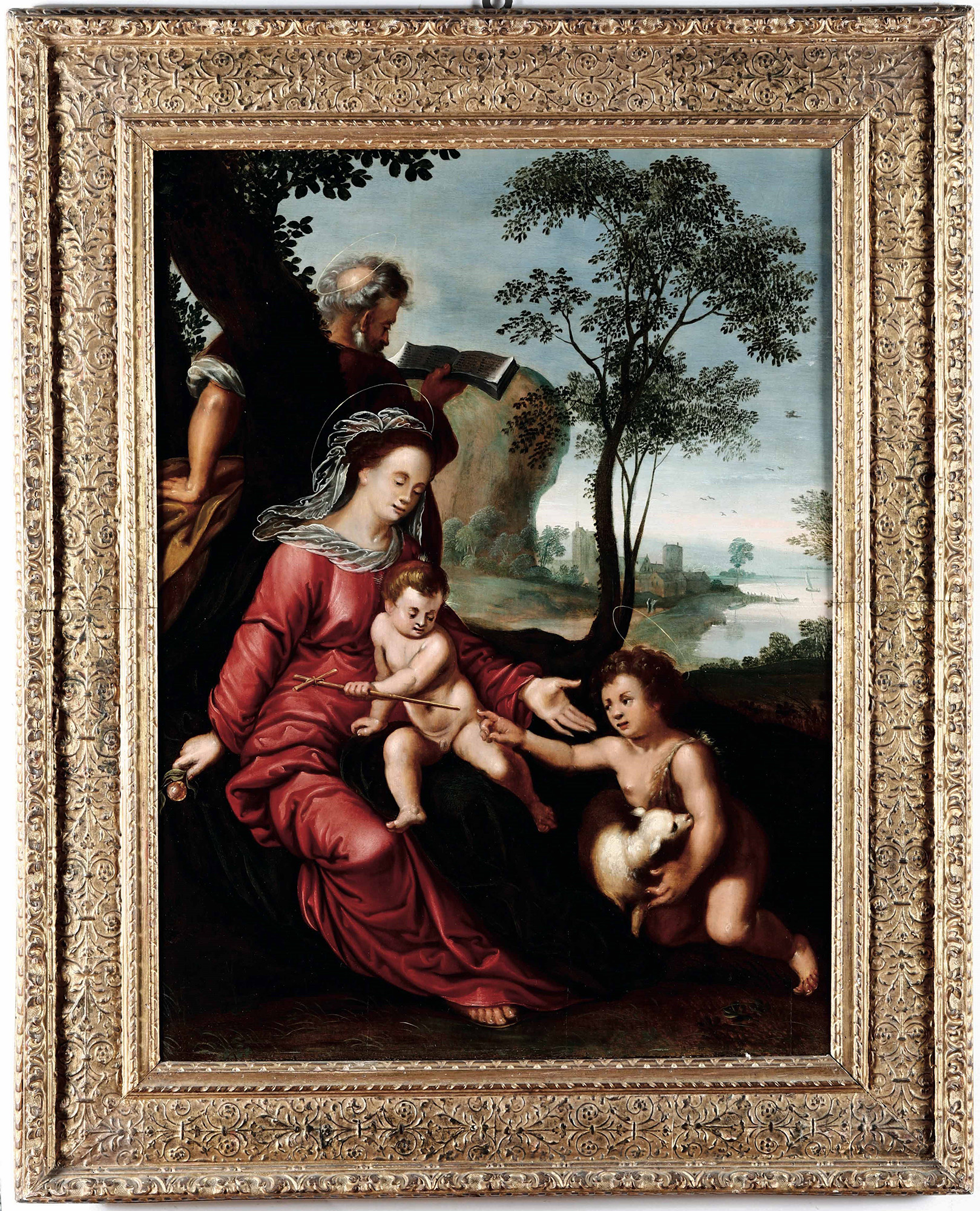 Sacra Famiglia con San Giovannino Scuola del XVII secolo, olio su tavola, Largh. 70,5 - Alt. 92,5 cm