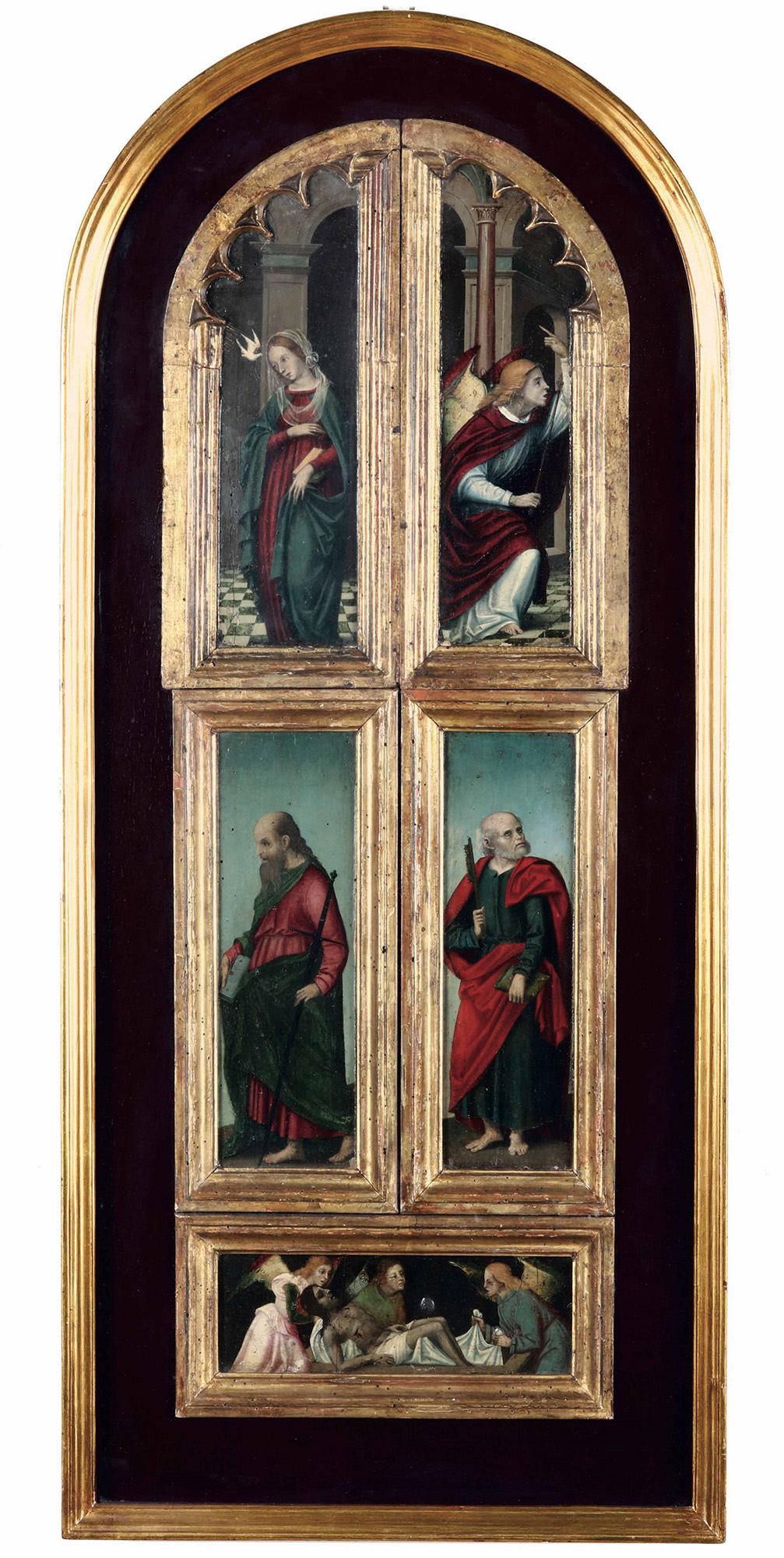 Polittico a cinque scomparti raffigurante l’Annunciazione, la Deposizione e santi Scuola lombarda dell'inizio del XVI secolo, tempera su tavola, W. 30,5 - H. 87 cm