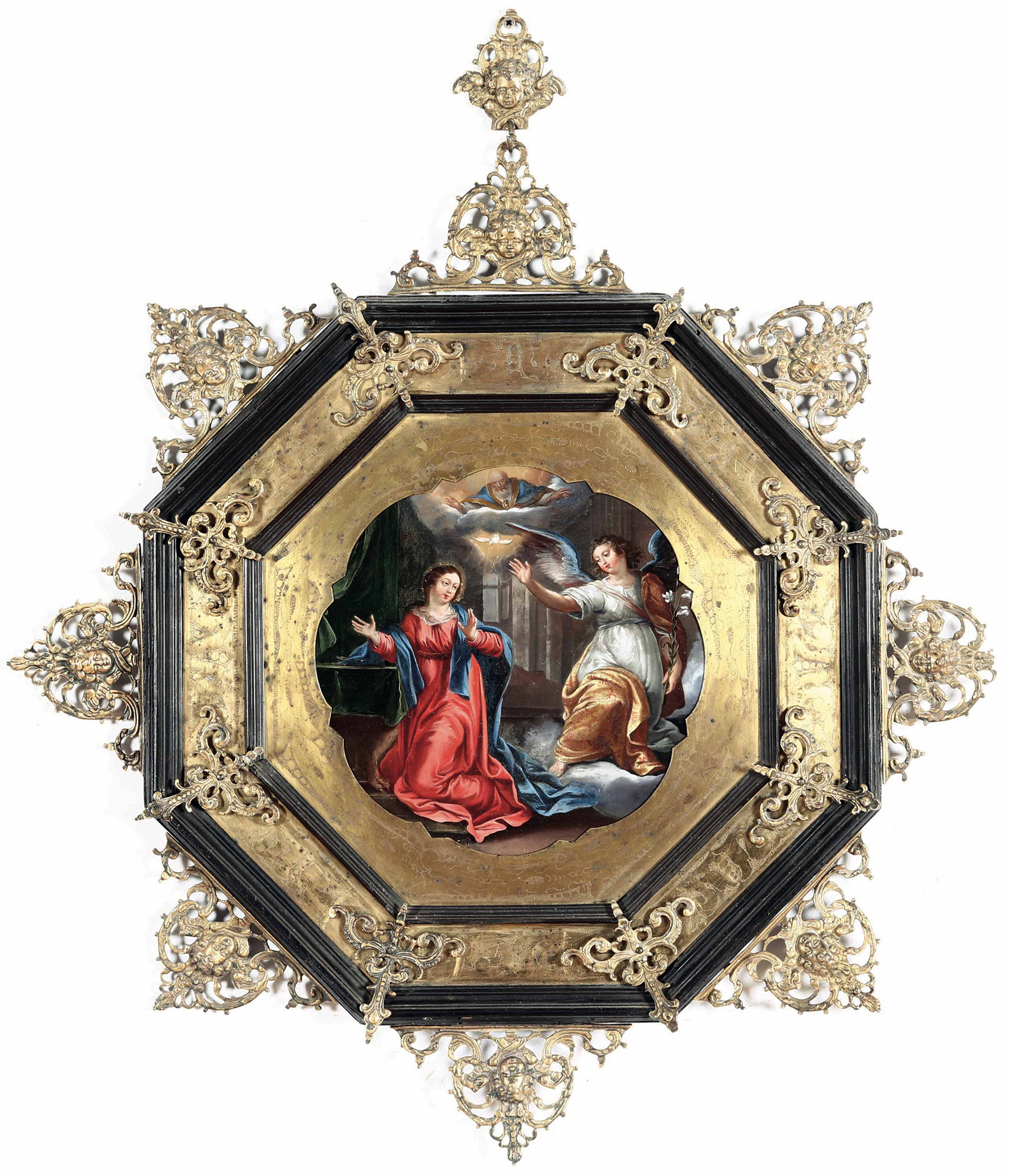 Annunciazione Scuola fiamminga del XVII secolo, in bella cornice ottagonale arricchita di bronzi dorati, olio su rame, W. 18 - H. 18 Cm