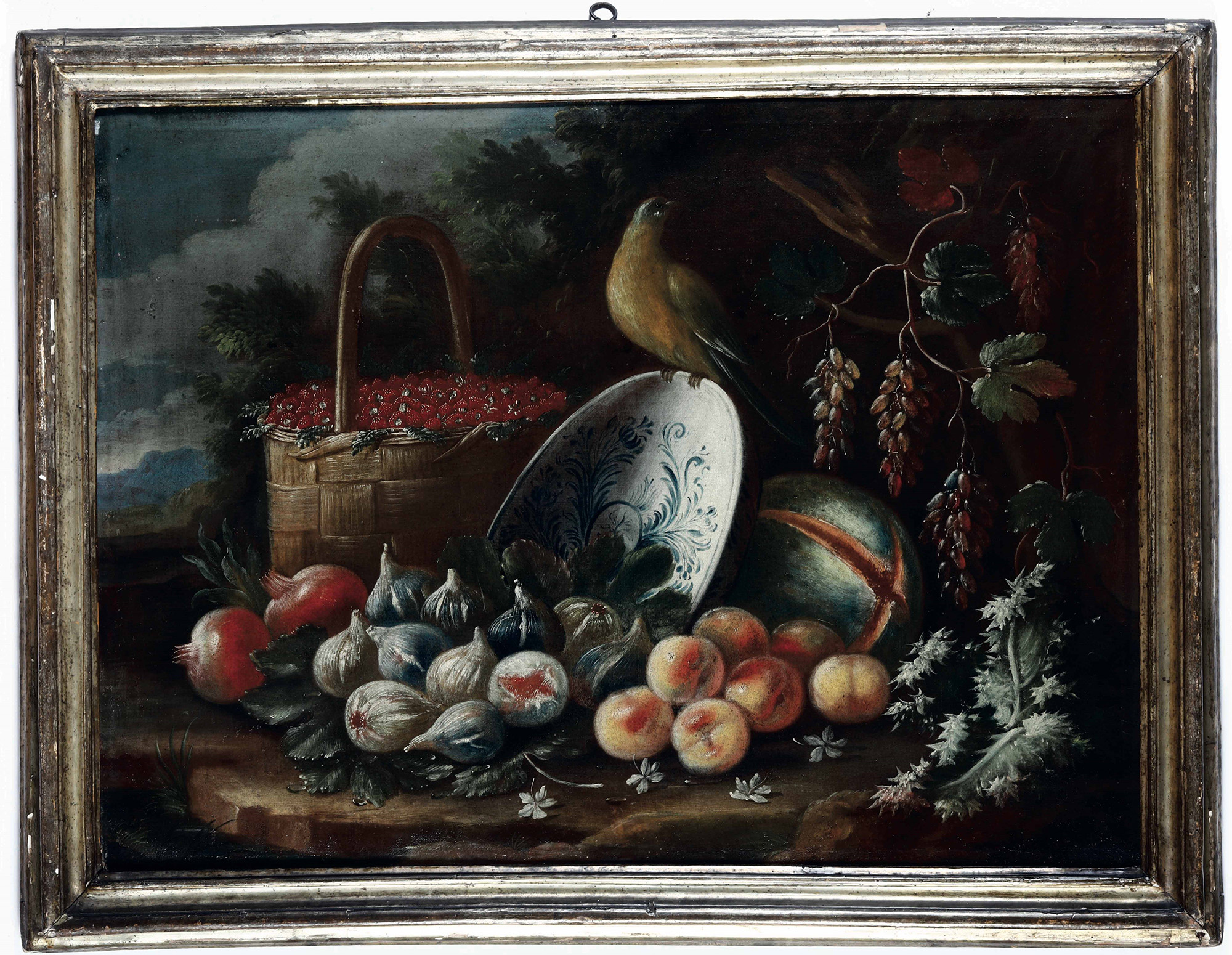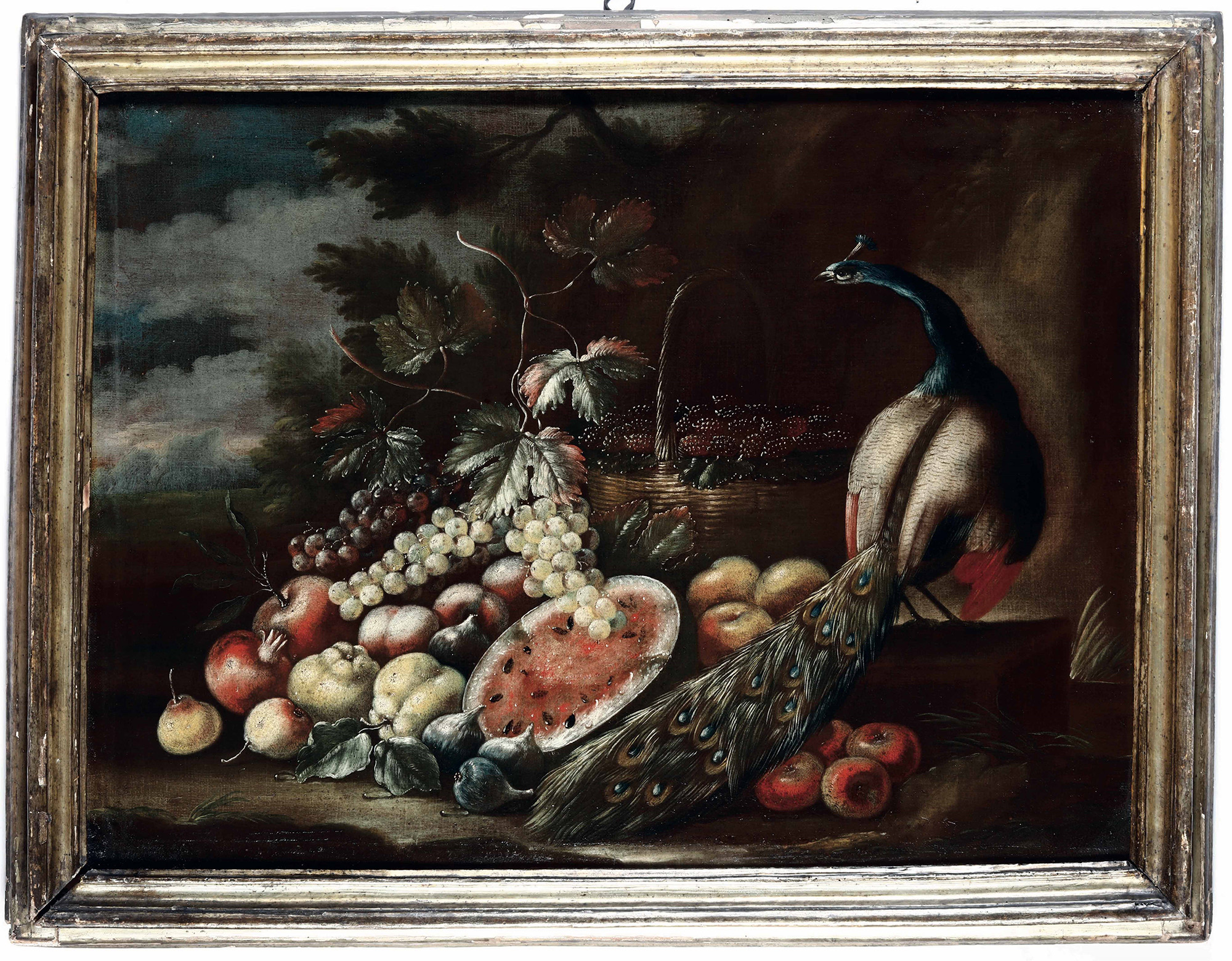Nature morte con frutta, vasellame e volatili Scuola dell’Italia meridionale del XVIII secolo