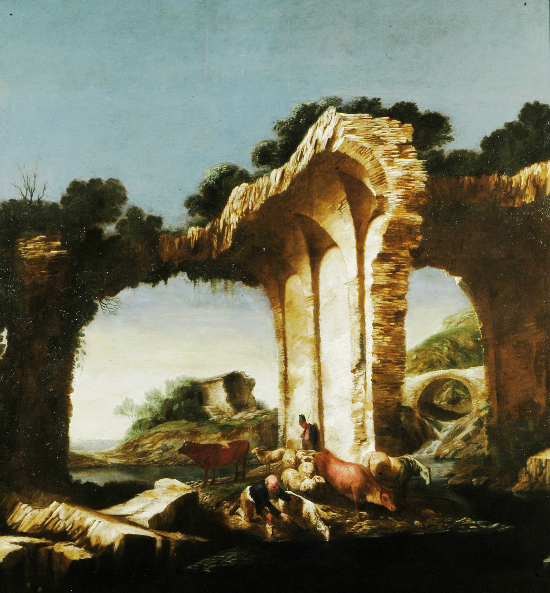 Lotto 81 | Antonio Travi (1608 Sestri Ponente-1665 Genova), Paesaggio con archietture, animali e pastori