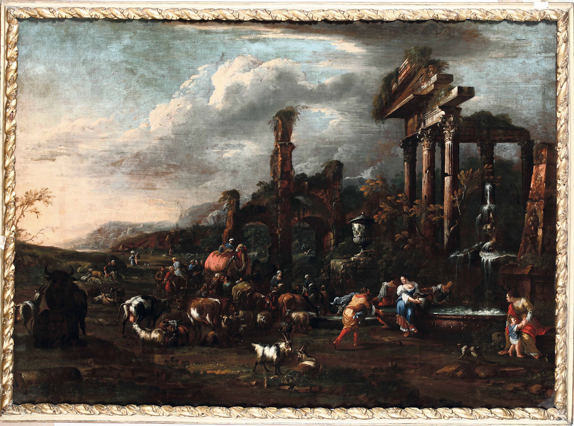 Scena pastorale con rovine architettoniche e figure Scuola genovese del XVII secolo, olio su tela, W. 190 - H. 136 cm