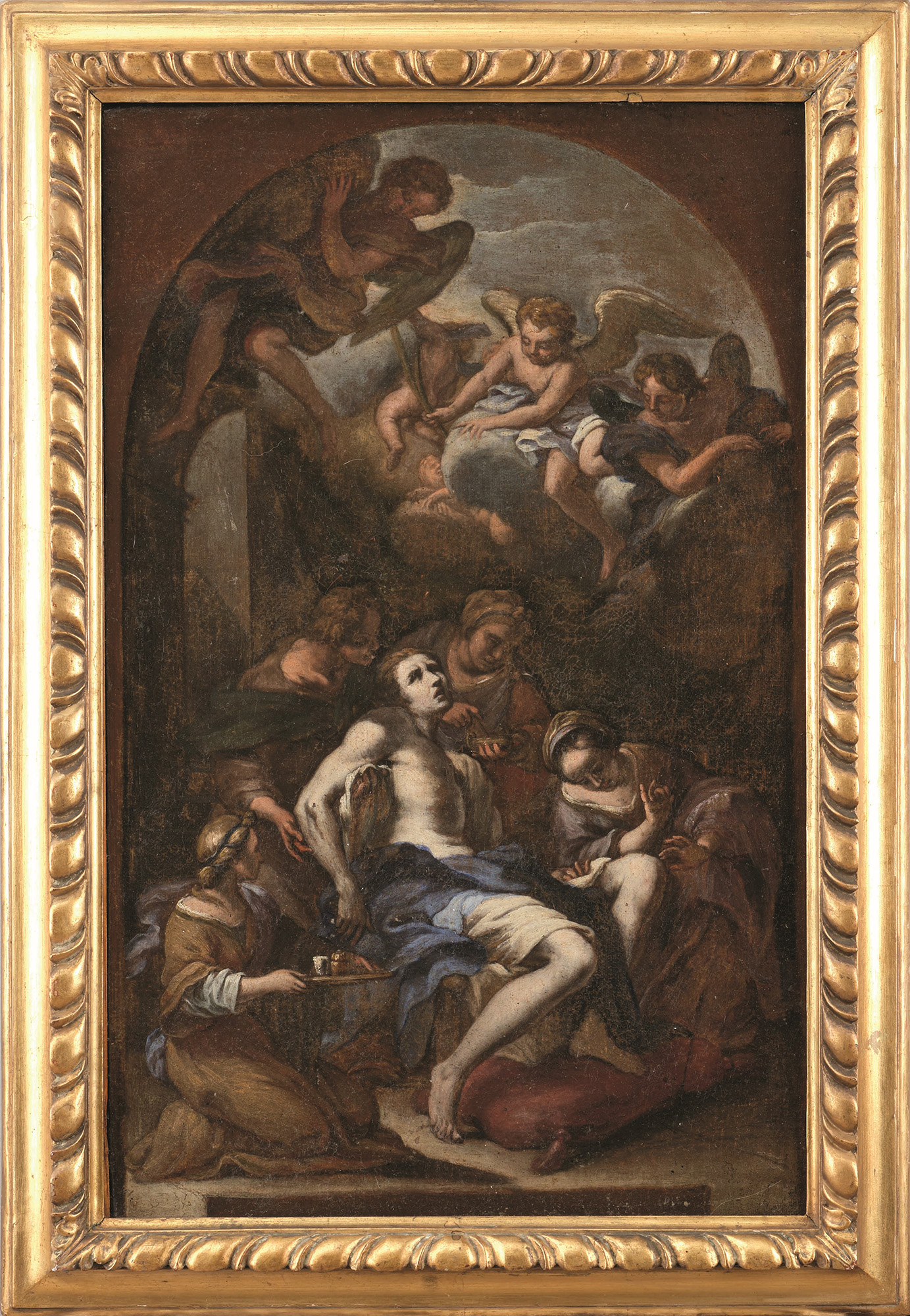 San Sebastiano curato da Sant' Irene Scuola del XVIII secolo, bozzetto a olio su tela, W. 42 - H. 68,5 cm