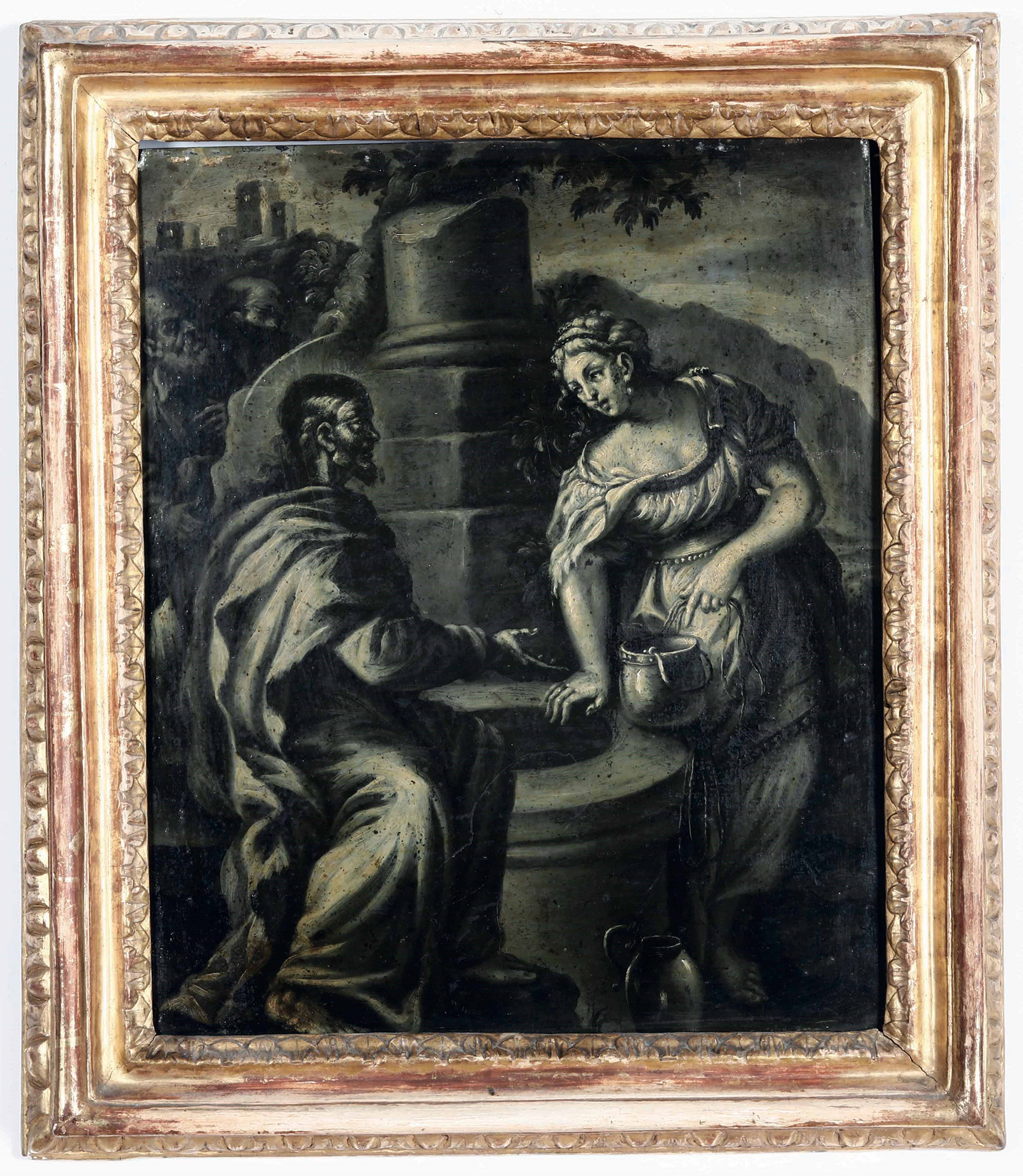 Cristo e la Samaritana al pozzo Scuola del XVII secolo, monocromo, olio su ardesia, W. 33 - H. 40 Cm
