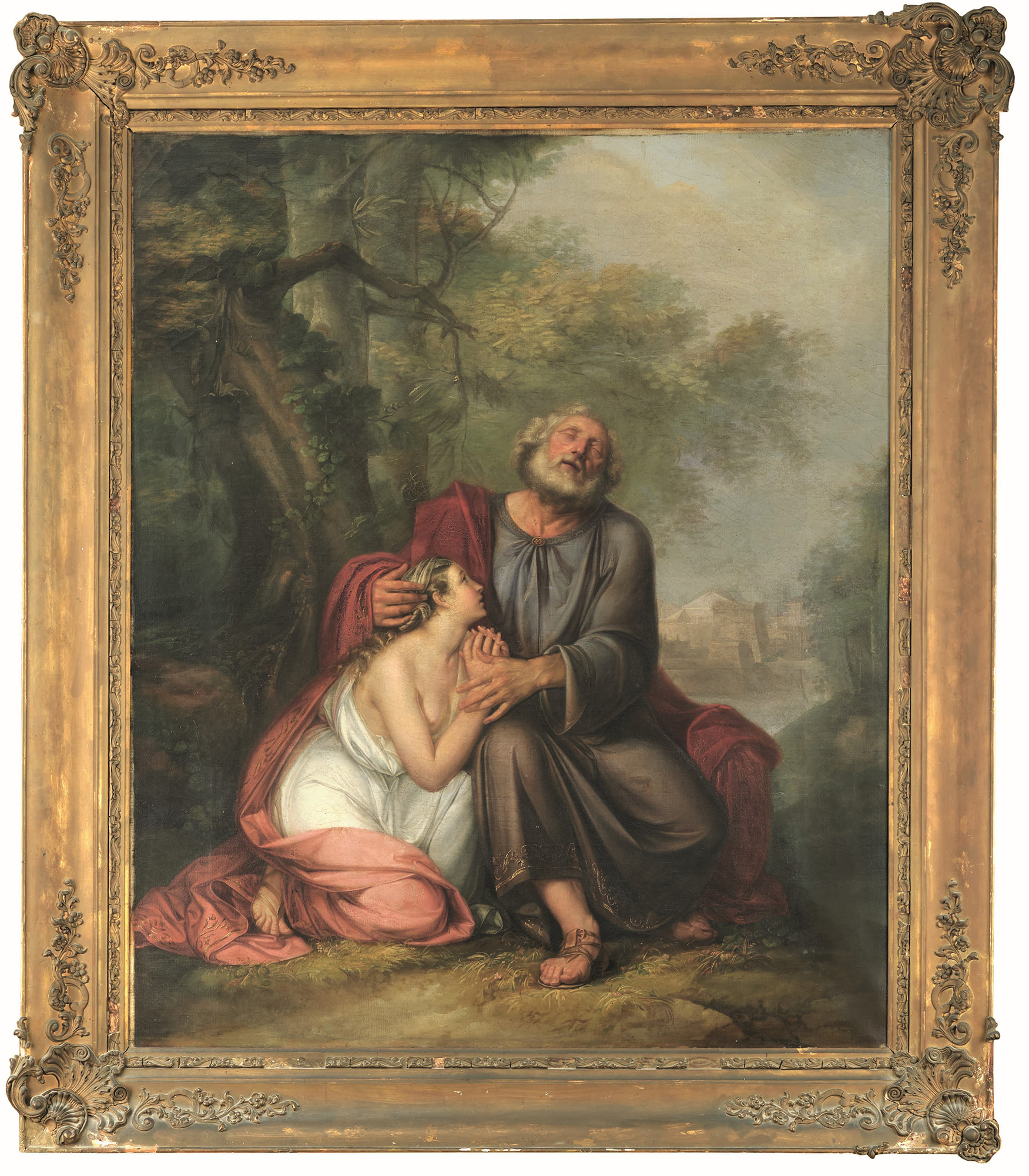 Scena di supplica Scuola neoclassica del XIX secolo, in cornice dorata, olio su tela, W. 99 - H. 120 cm