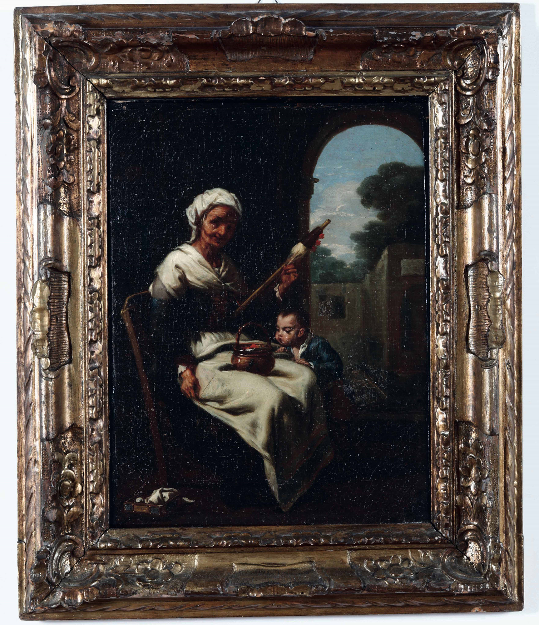 Vecchia che fila Scuola del XVII secolo, in cornice intagliata a mecca, olio su tela, W. 31 - H. 41 cm