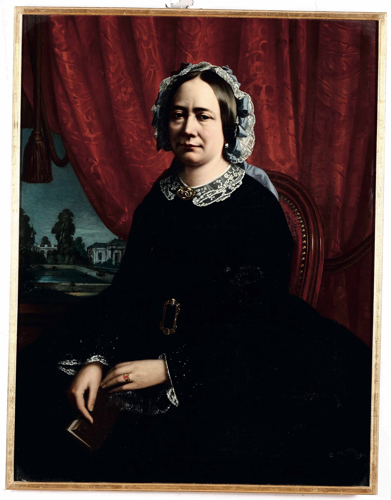 Mathias Leyendecker (1821 ?-1871 Parigi) attribuito a, Ritratti di coniugi, coppia di dipinti, firmati e datati 1869, olio su tela, W. 88 - H. 115 cm