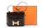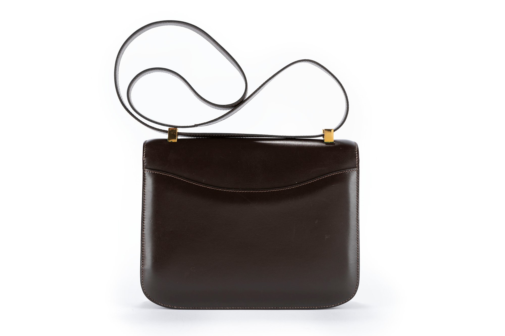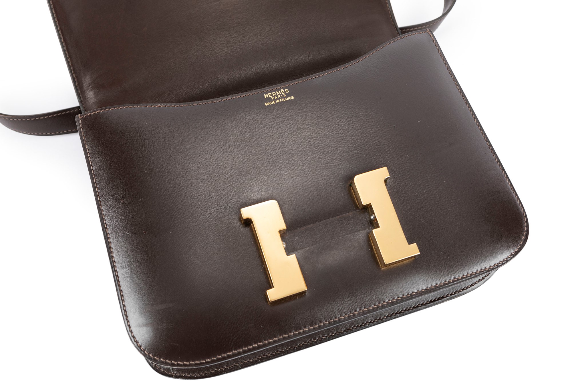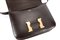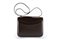 in pelle color marrone scuro, con tracolla regolabile, dettagli in metallo dorato, con scatola, cm 23 (lievi difetti).
