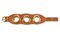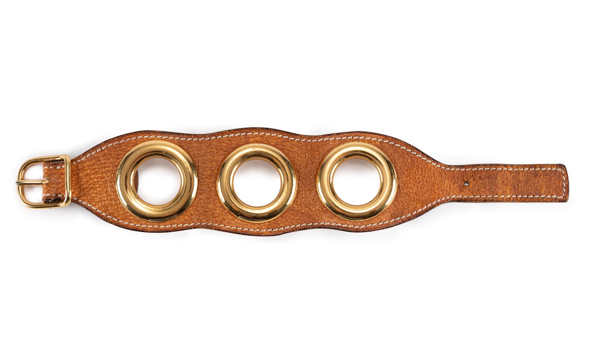 in cuoio con inserti ad oblo' in metallo dorato, cm 23, con sacchetto (lievi difetti).