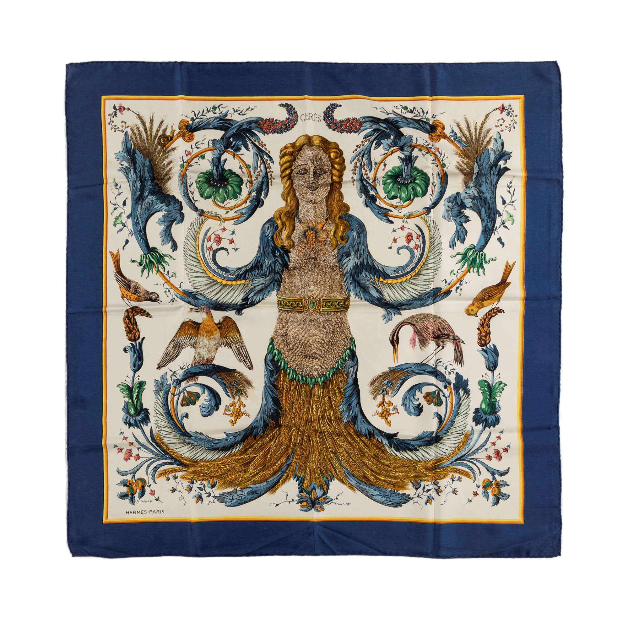 in seta su fondo color panna, bordo color blu, Françoise Faconnet (difetti).