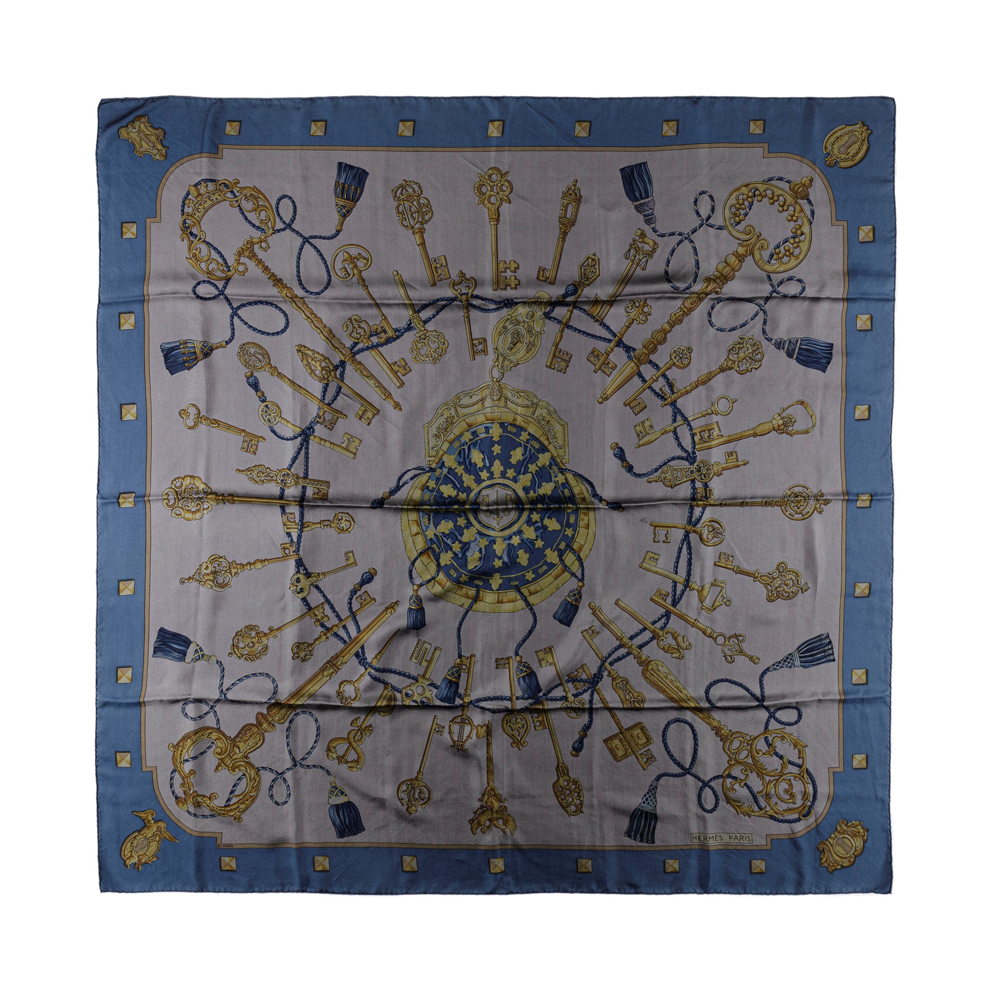 in seta tonalità grigio con bordo blu carta da zucchero, Caty Latham, cm 140 x 140 (lievi difetti).
