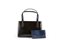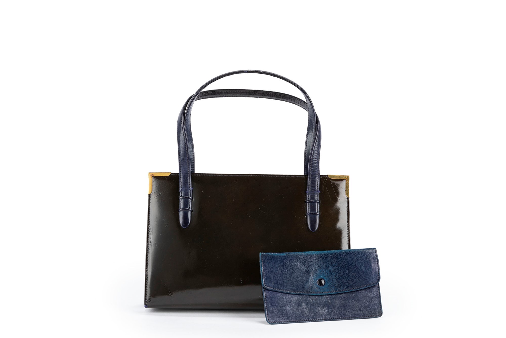 in vernice nera e pelle color bluette, doppi manici, dettagli in metallo dorato, con sacchetto, cm 23,5 (difetti).