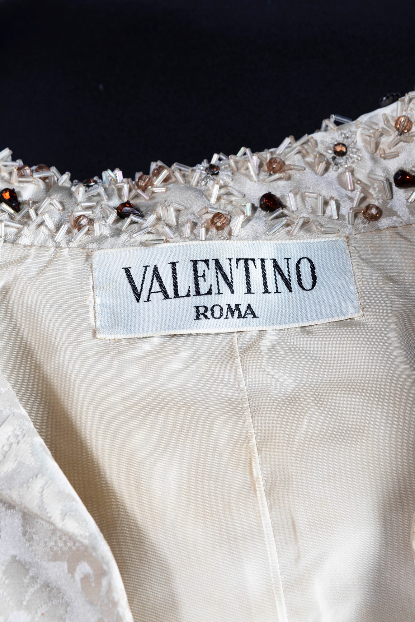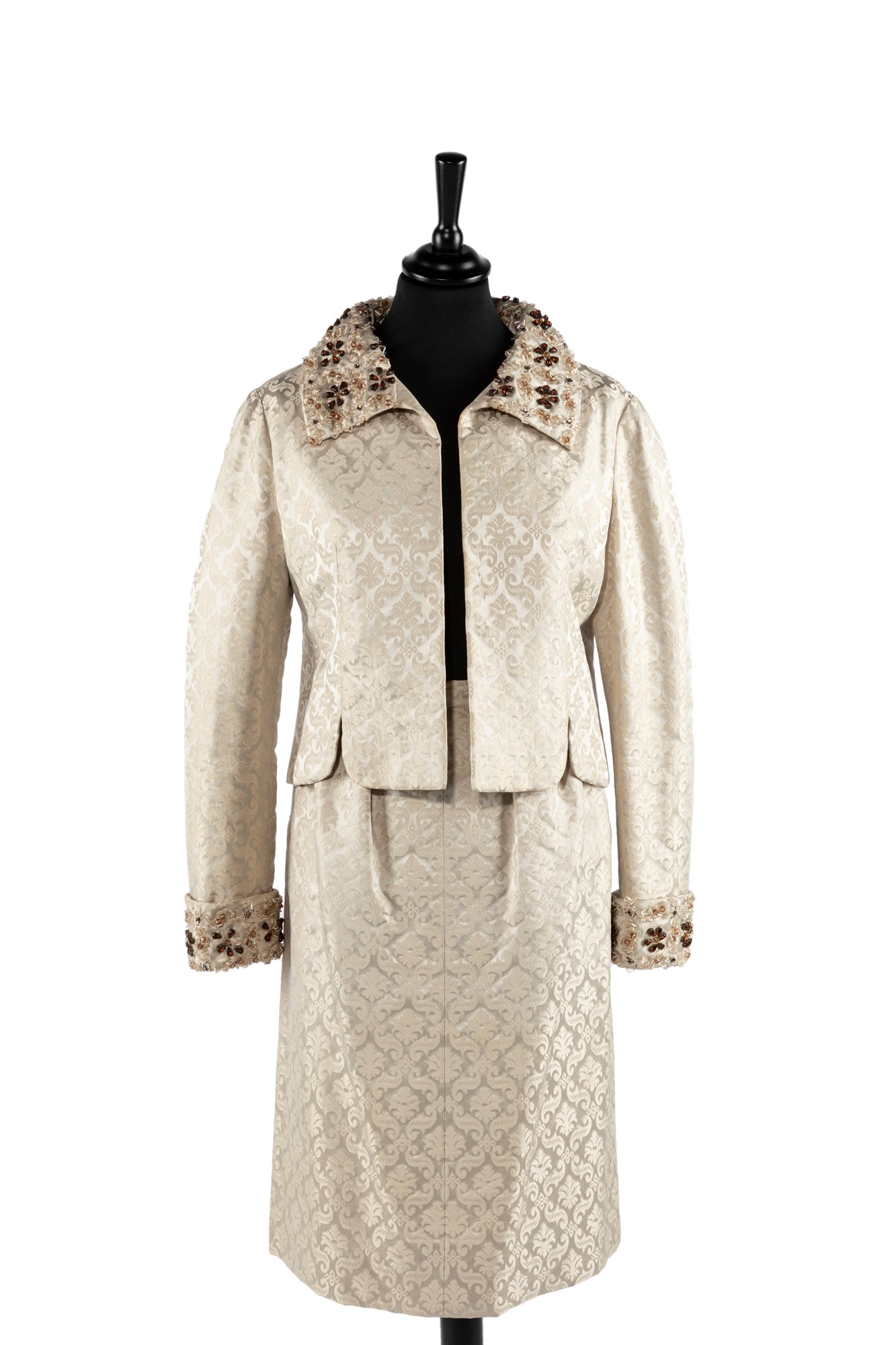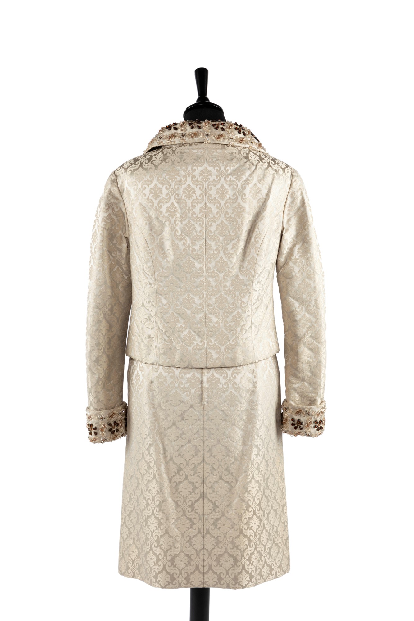 in raso di seta operato color crema, polsini e colletto ricamati con strass (difetti e mancanze).