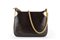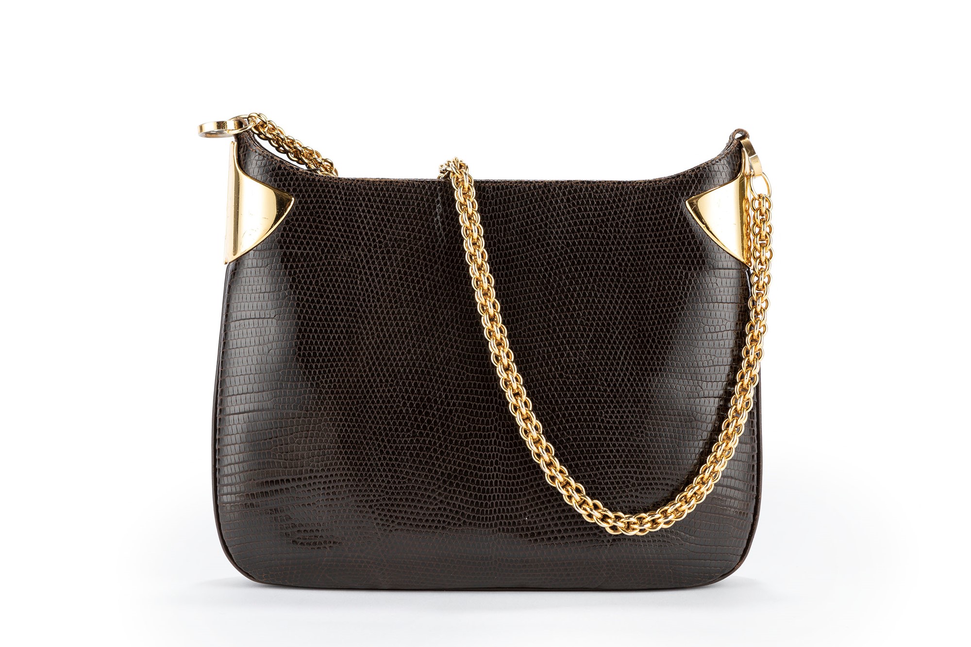 in pelle di lucertola color cioccolato, dettagli laterali e tracolla a catena in metallo dorato, pre convenzione Cites, cm 30, Mod. Brev. N. 36283 (lievi difetti).