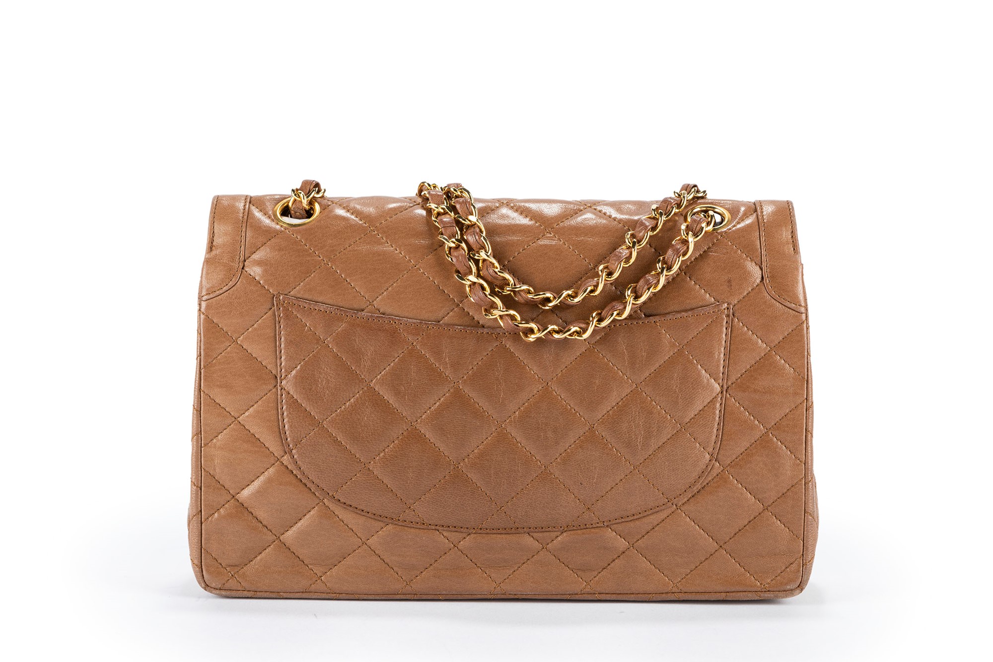 in pelle trapuntata color caramello, tracolla a catena in metallo dorato, dettaglio logo in metallo bicolore, cm 26, con sacchetto e scatola (lievi difetti).