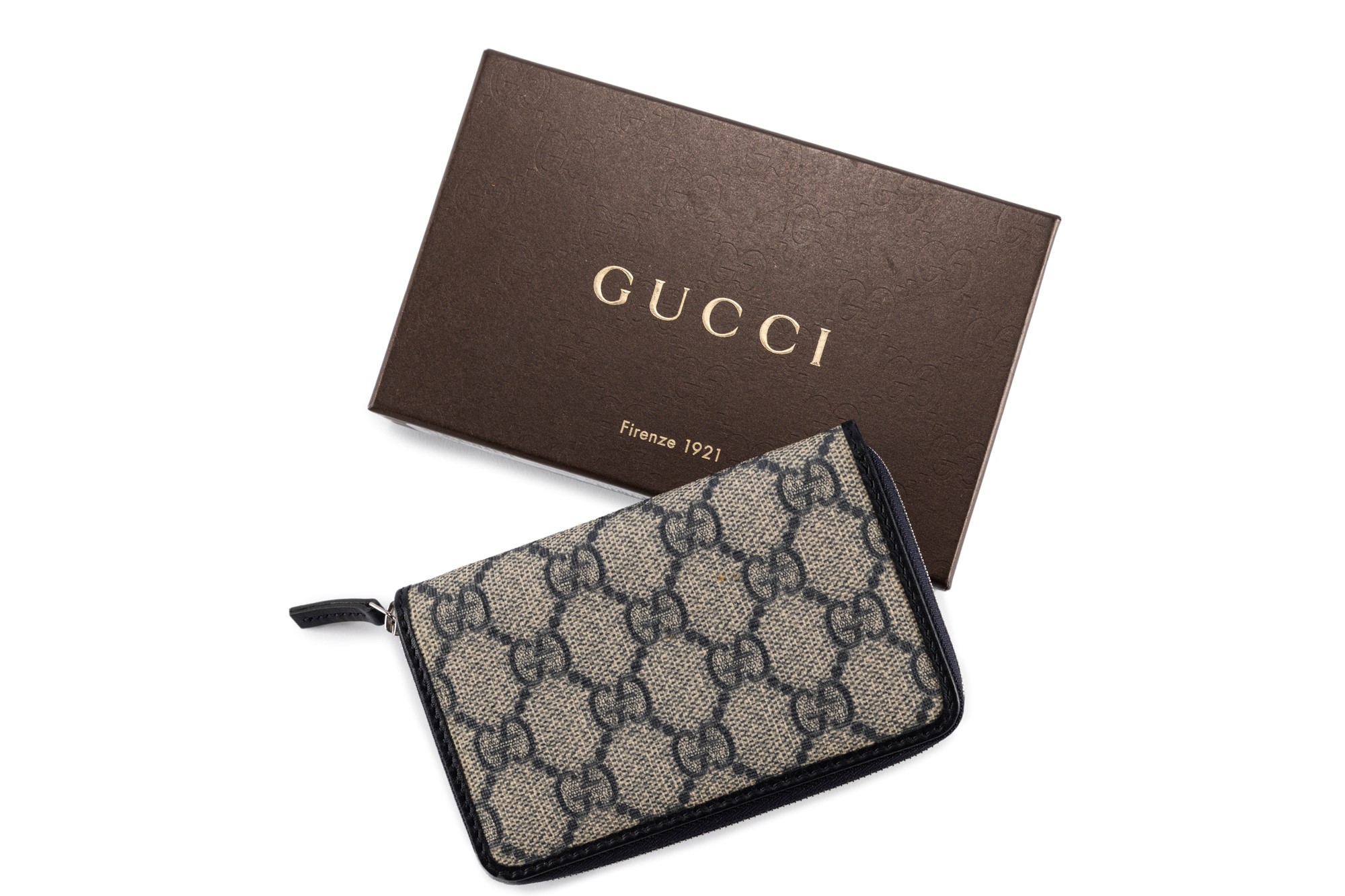 in tessuto GG plastificato bianco e blu, a tre scomparti, con scatola, cm 12 x 8 (nuovo mai usato).