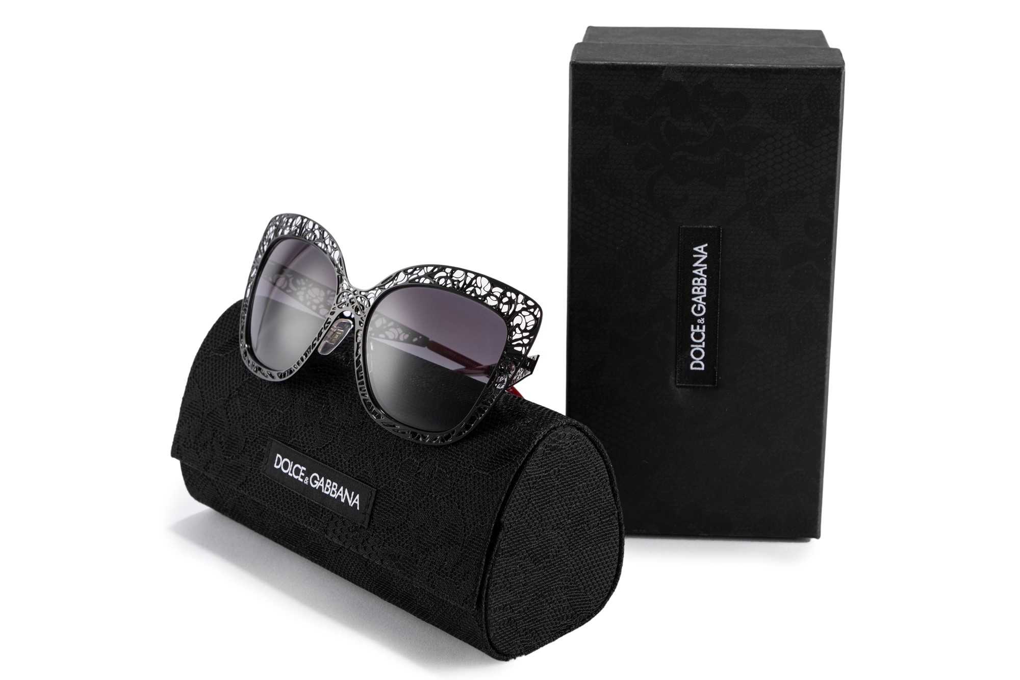 con montatura in metallo traforato color nero effetto pizzo, con sacchetto e scatola.