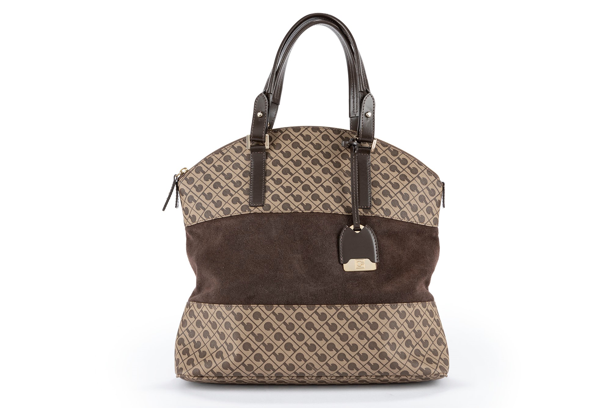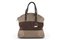 in camoscio color marrone e pelle stampata millerighe, doppi manici, dettagli in metallo dorato, cm 35, con sacchetto.