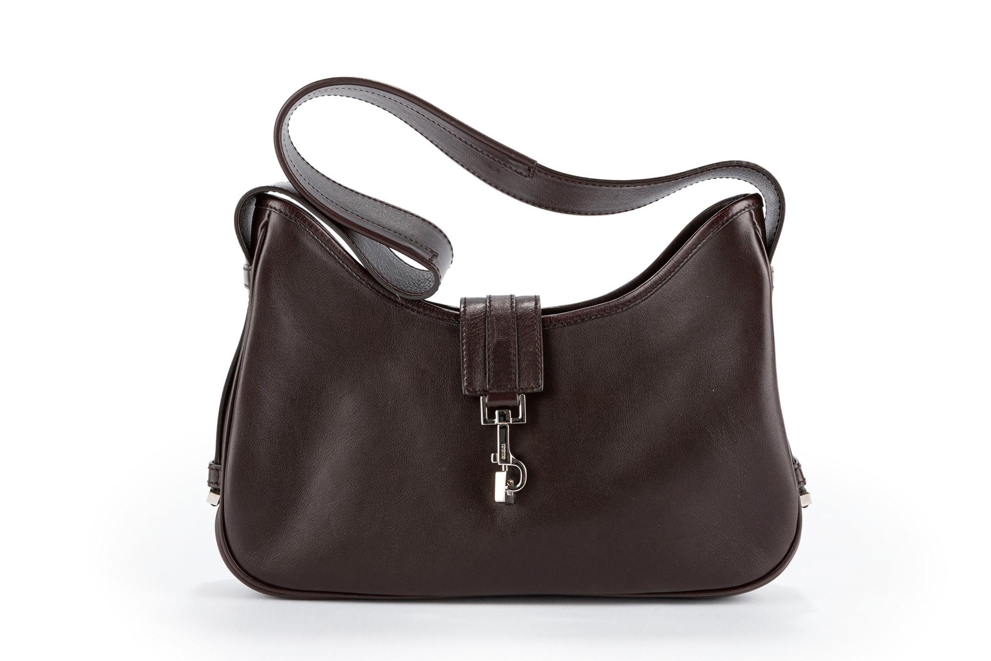 in pelle color marrone con tracolla, cm 28, con sacchetto (difetti).
