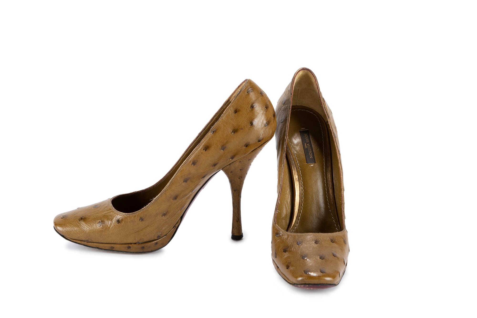 in pelle di struzzo color tabacco, tacco cm 12, misura 40 (lievi difetti).