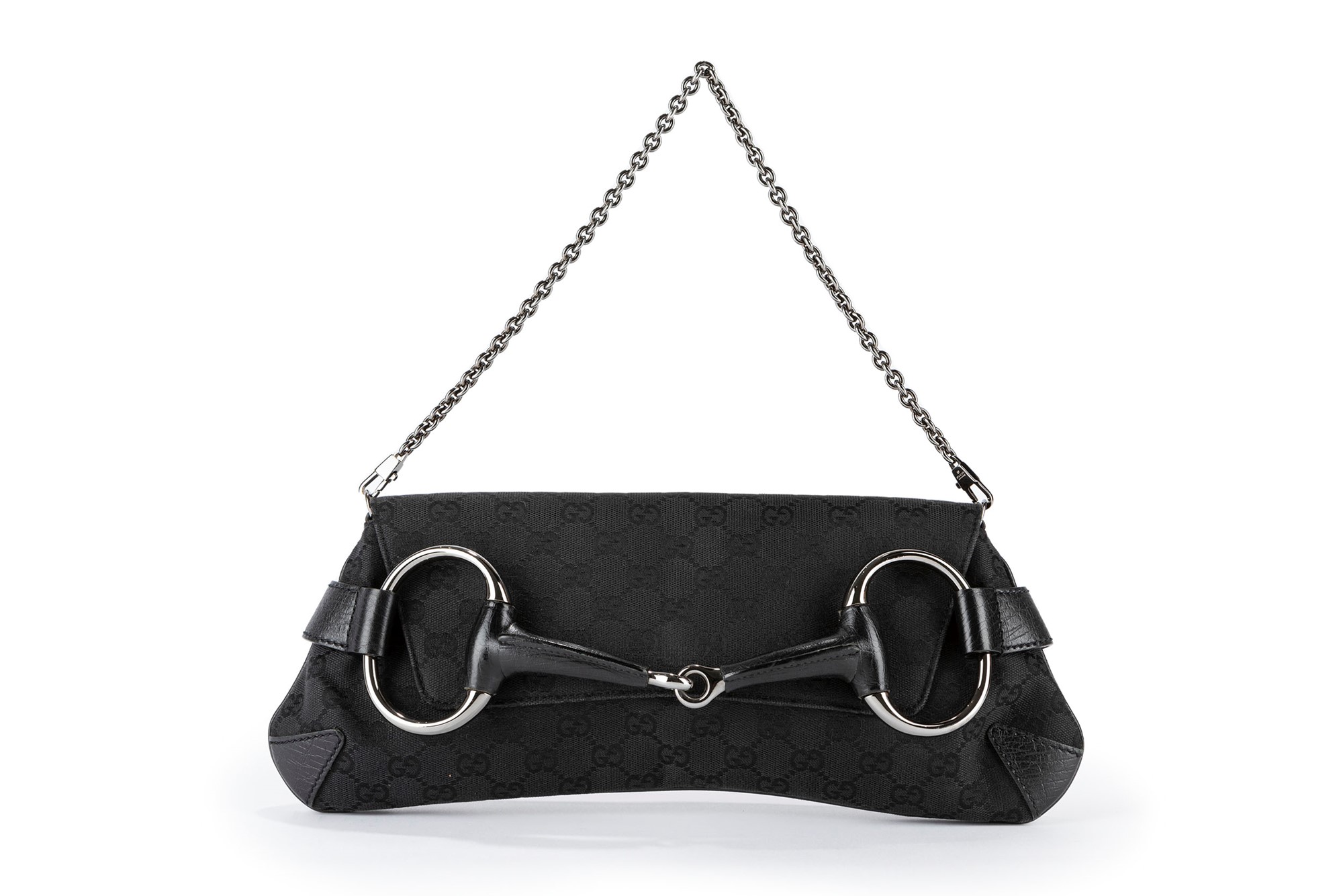in tessuto GG color nero, tracolla a catena staccabile, grande dettaglio a morsetto, cm 37, con sacchetto.