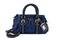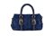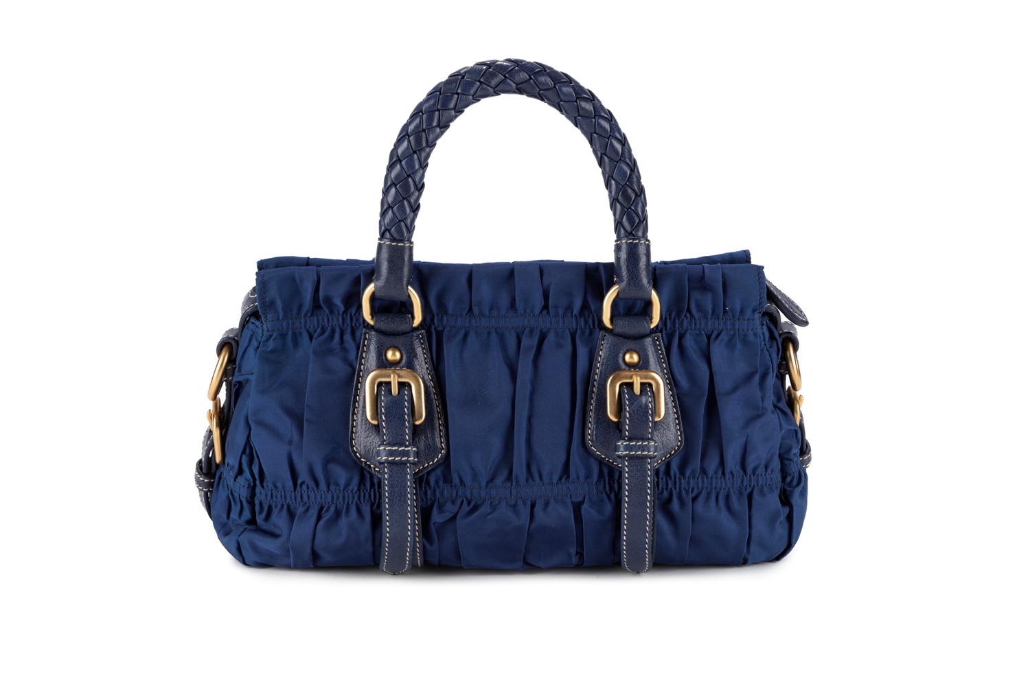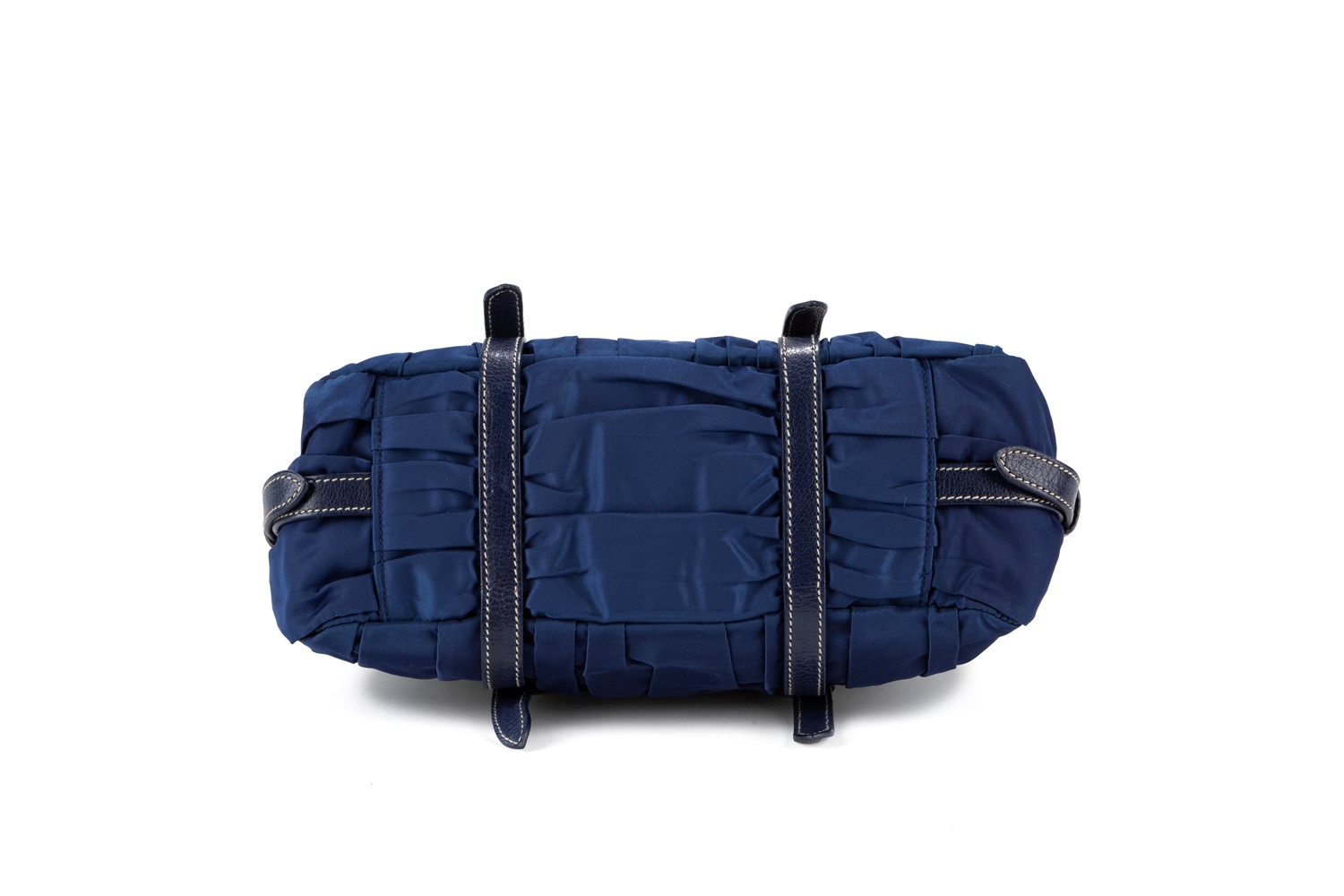 in tessuto tecnico color bluette, doppi manici e dettagli in pelle intrecciata, chiusura con zip e tracolla staccabile, cm 28.