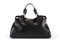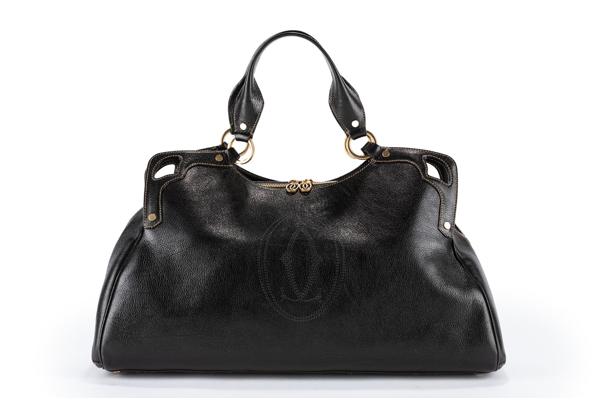 in pelle color nero, doppi manici, dettagli in metallo dorato, chiusura con cerniera, fodera in tessuto logato, con sacchetto, interno a tre scomparti, cm 48.