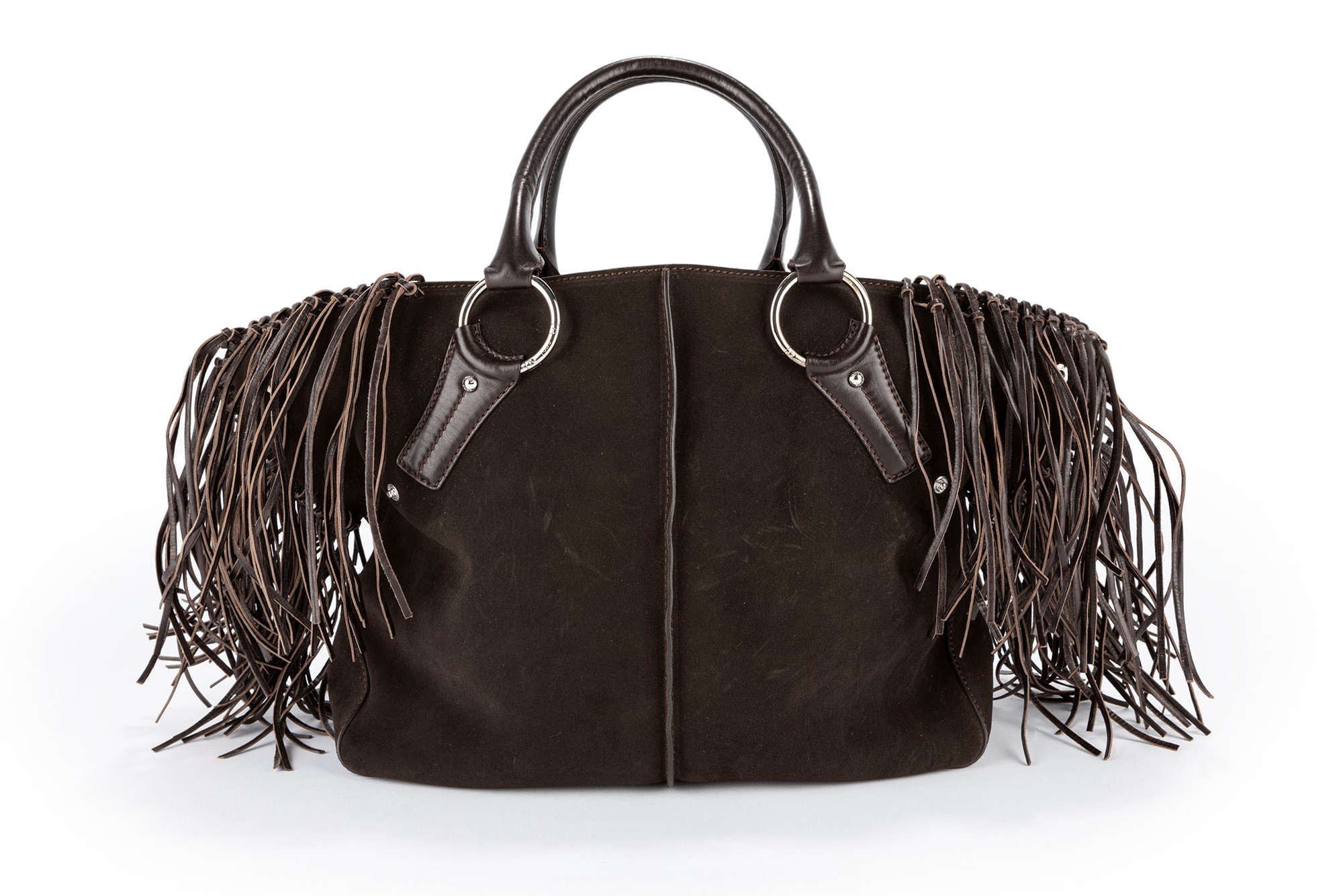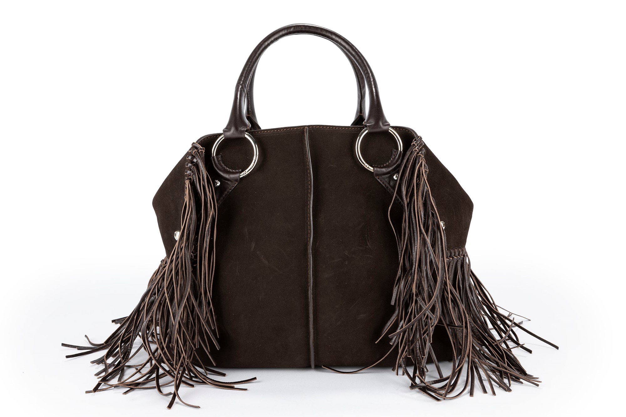in pelle di camoscio color marrone, doppi manici, dettagli in metallo ed applicazioni di frange sui lati, cm 35, con sacchetto (lievissimi difetti).