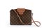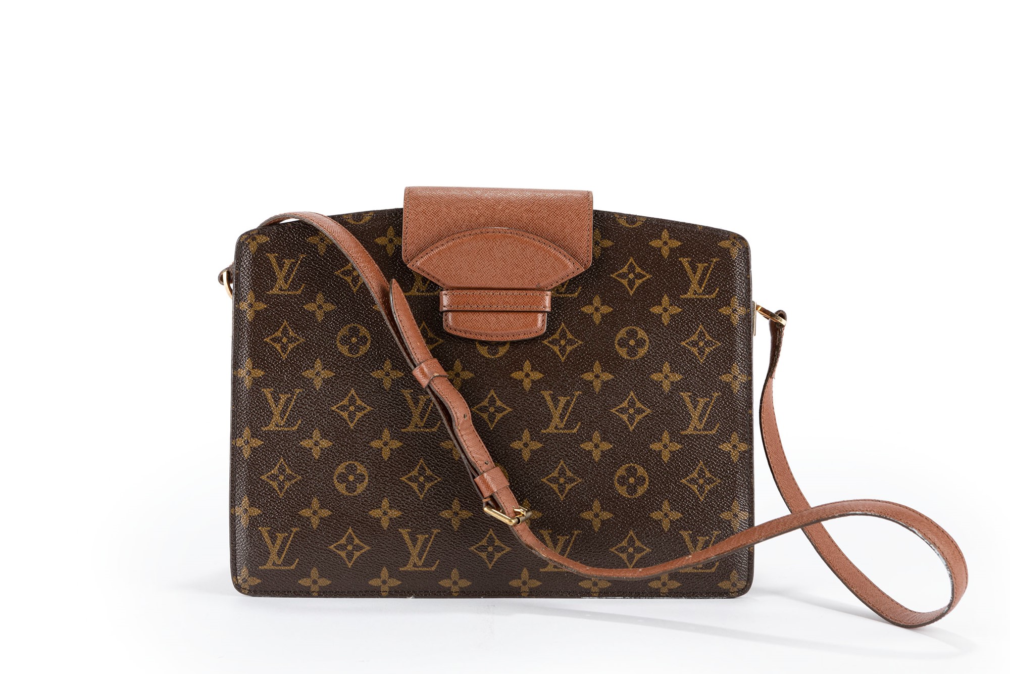 in tela monogram, doppio scomparto a soffietto, con tracolla, dettagli in metallo dorato, cm 30 (difetti).