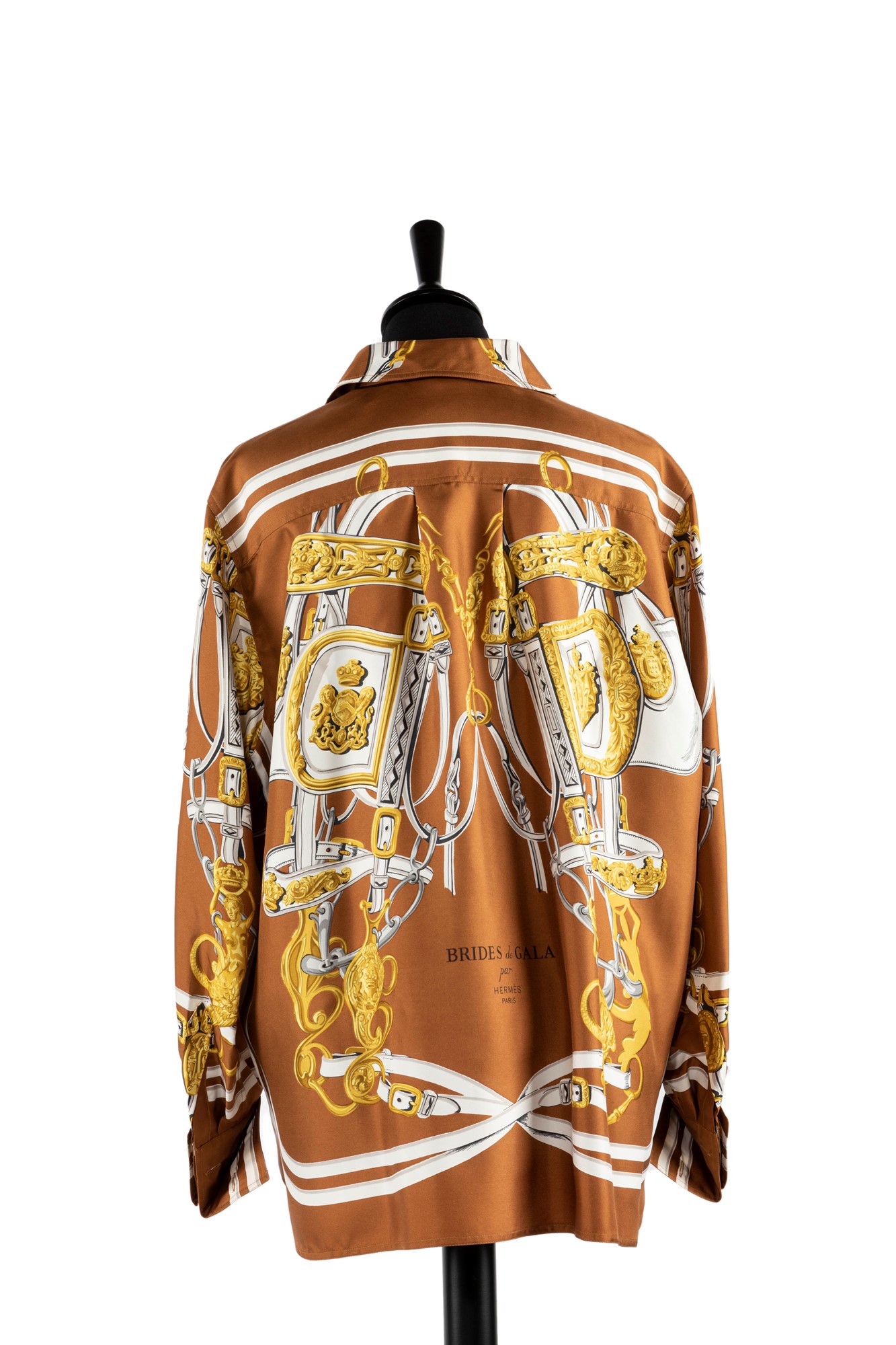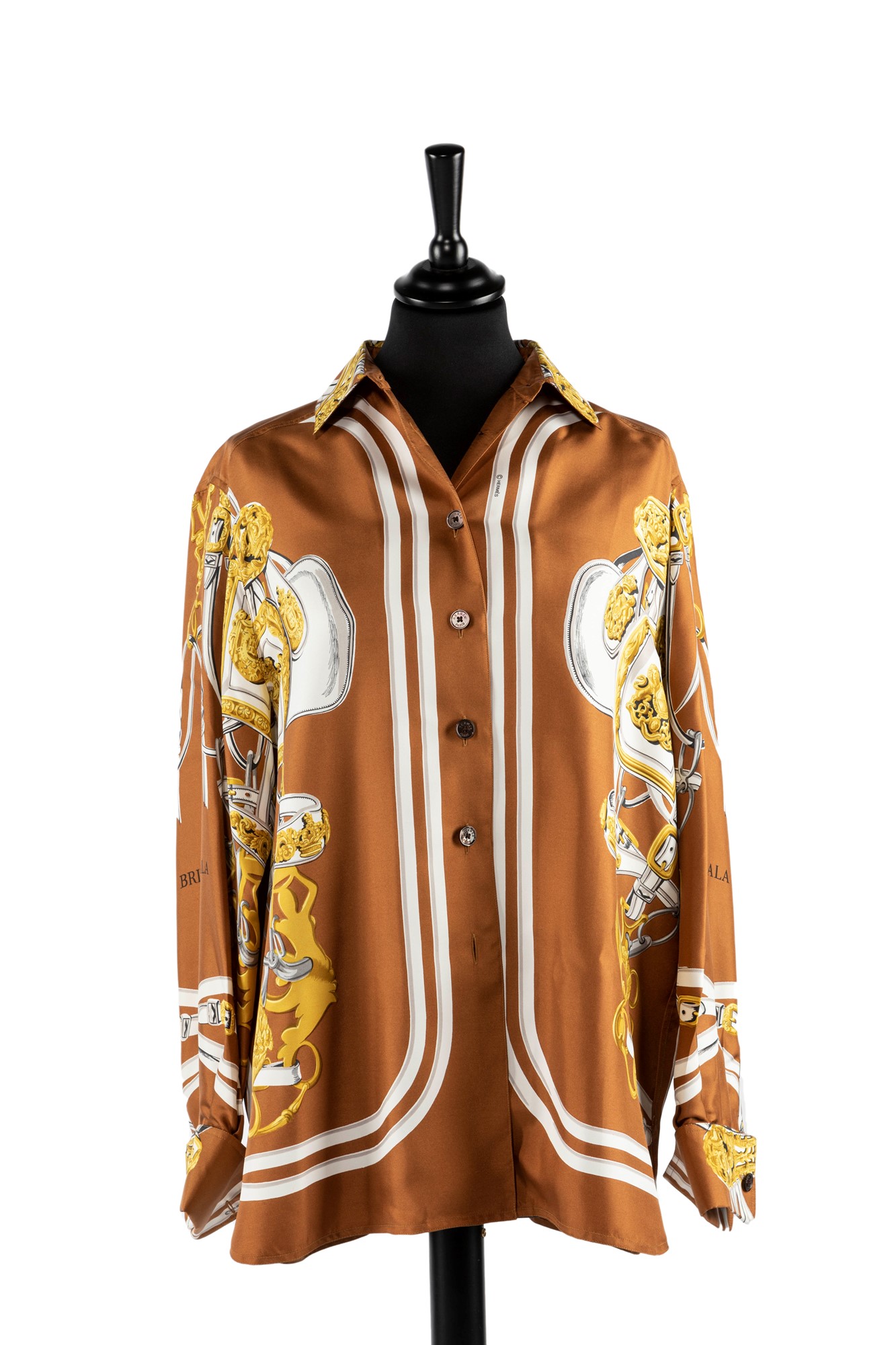 in seta su fondo color caramello, bottoni in madreperla logati, tg 40, con scatola.