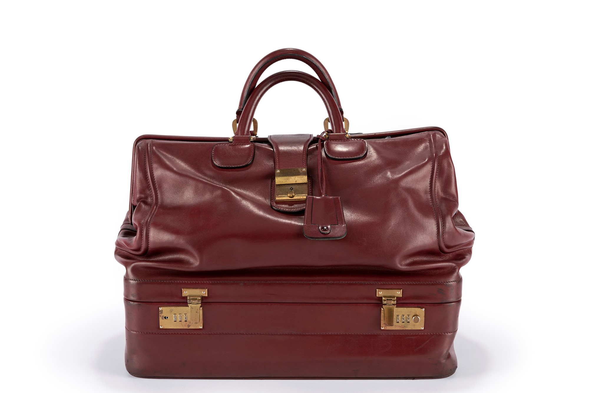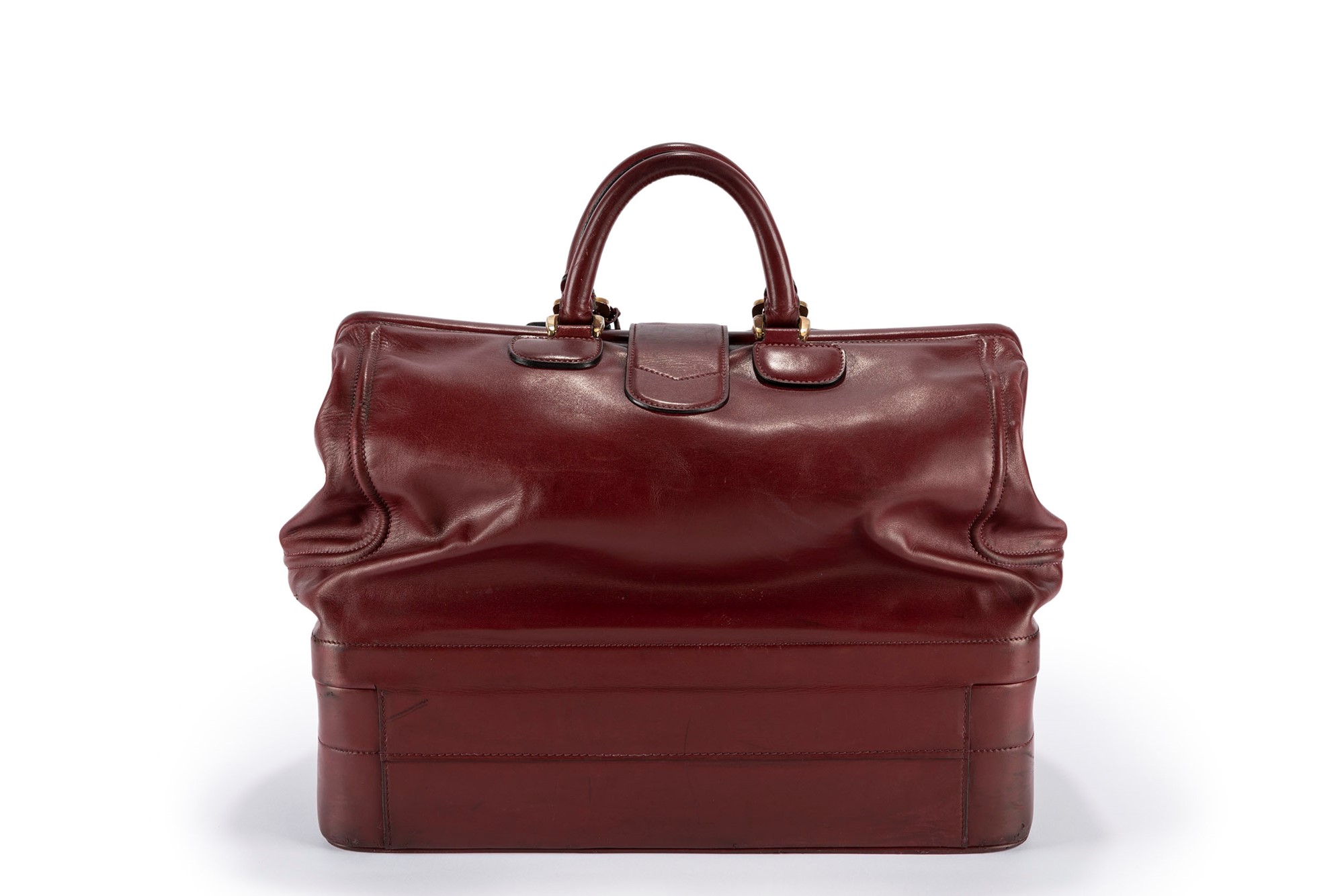 in pelle color bordeaux, doppi manici, dettagli in metallo dorato, doppio fondo, misure cm 48 x 29 x 40 (difetti e mancanze).